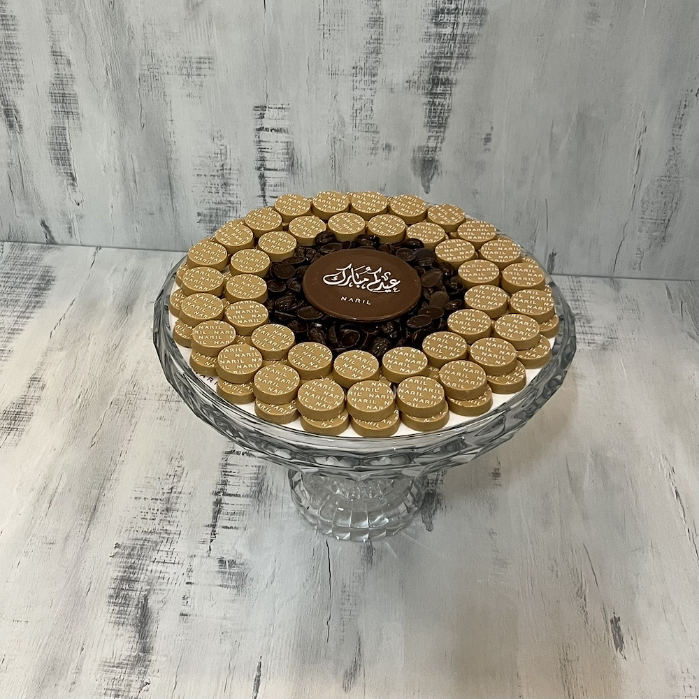 This crystal tray contains 98 pieces of chocolates in rahash with pistachio, kinder with kunafa, caramel almond, pistachio with nuts and mixed nuts flavors.