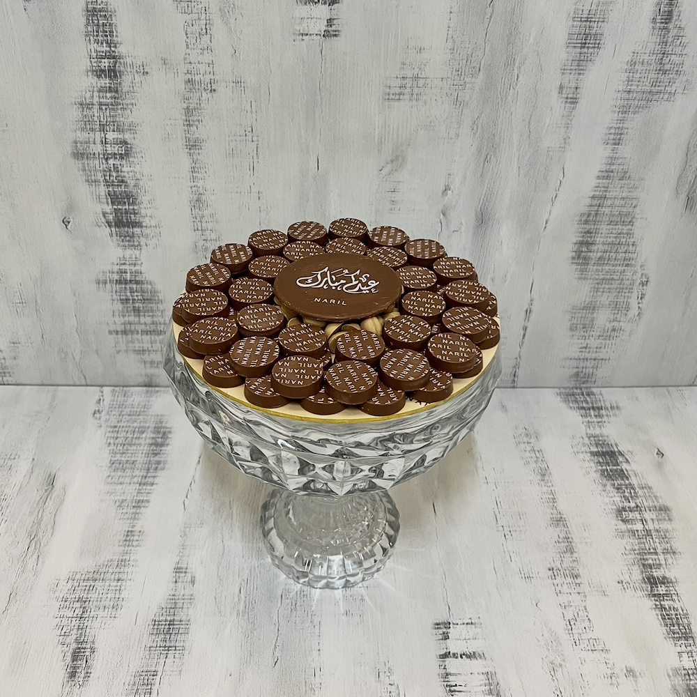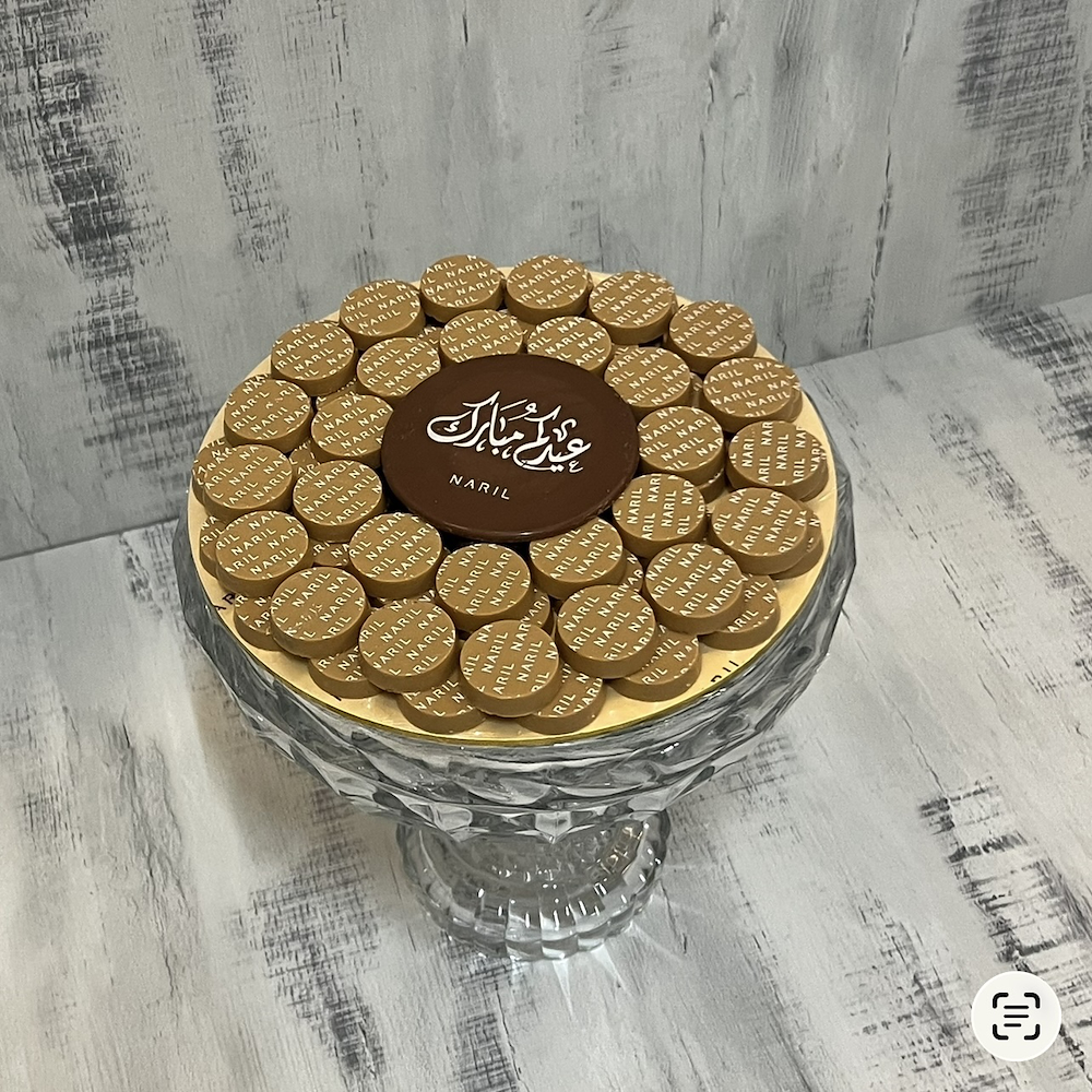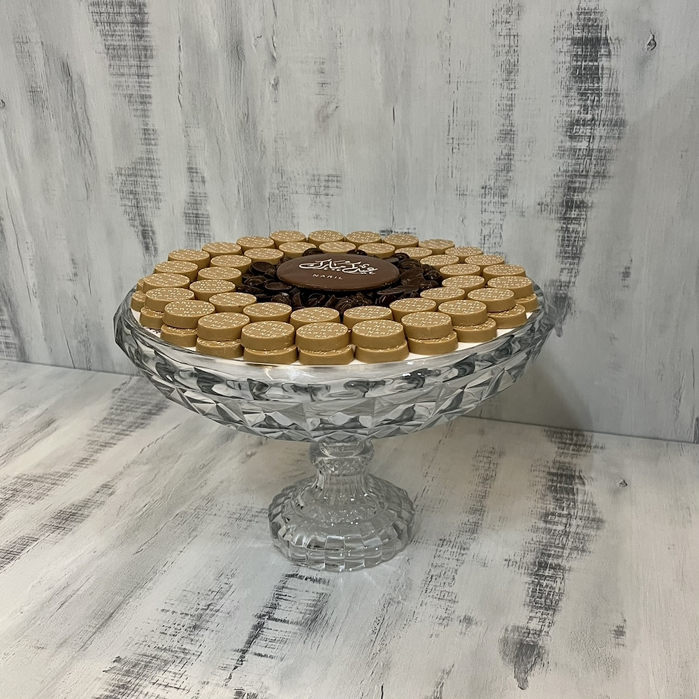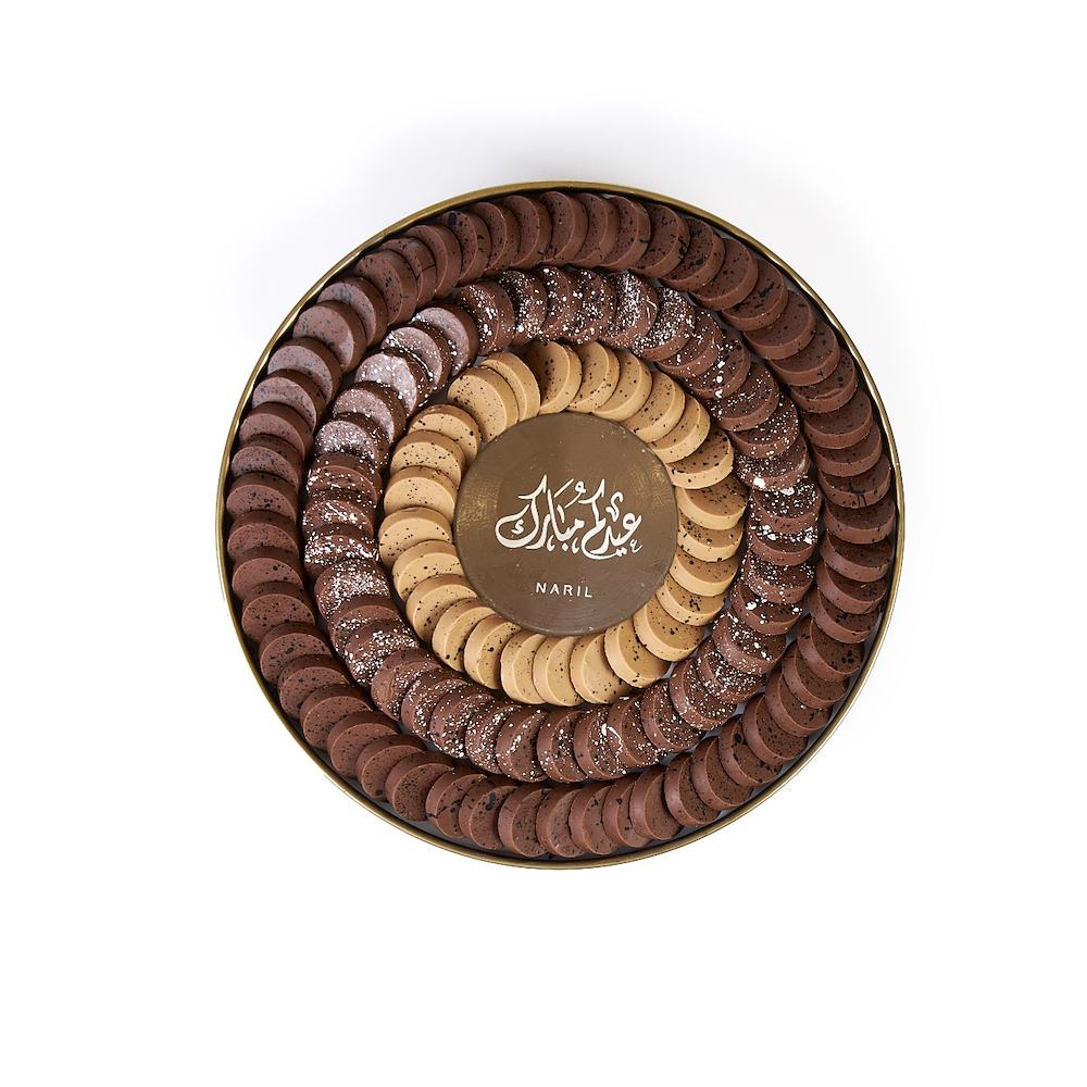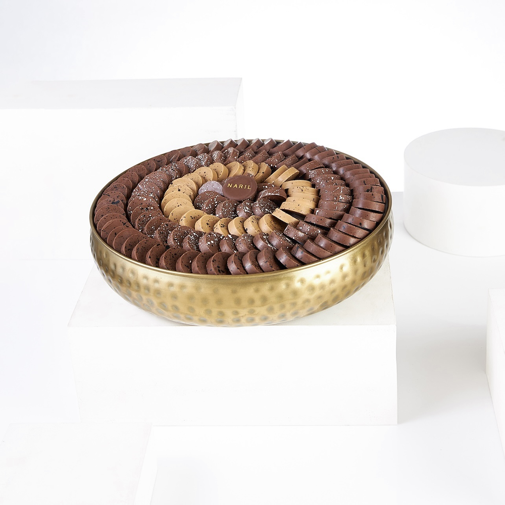 A steel tray featuring 125 pieces of chocolate in cardamom with digestive, salted caramel, almond truffle, and kinder kunafa flavors.