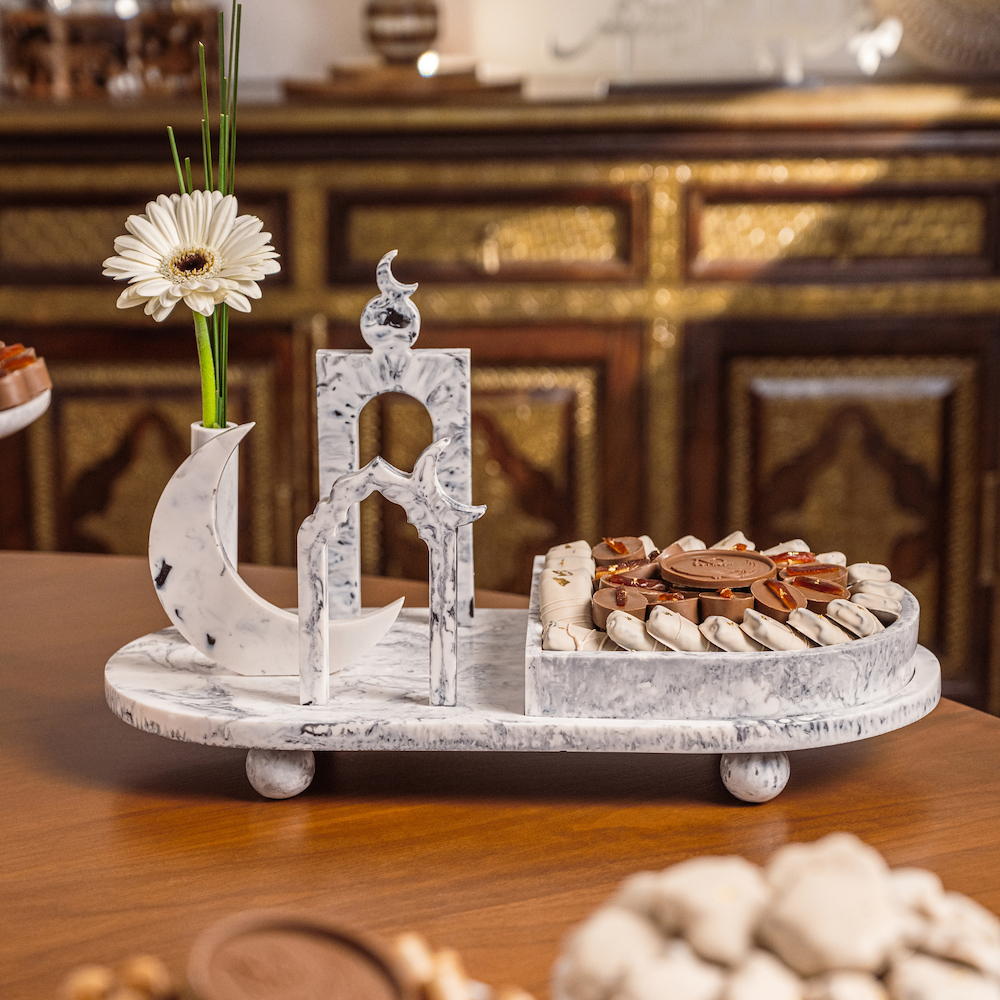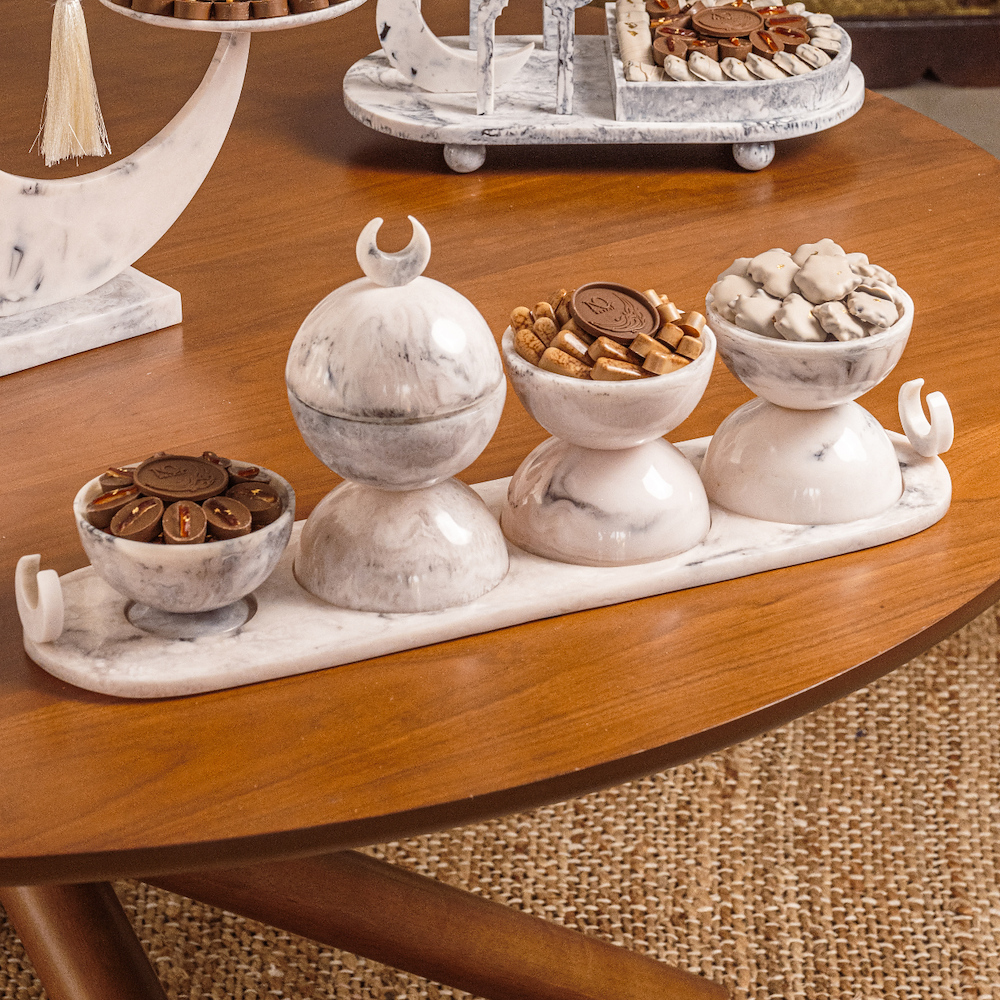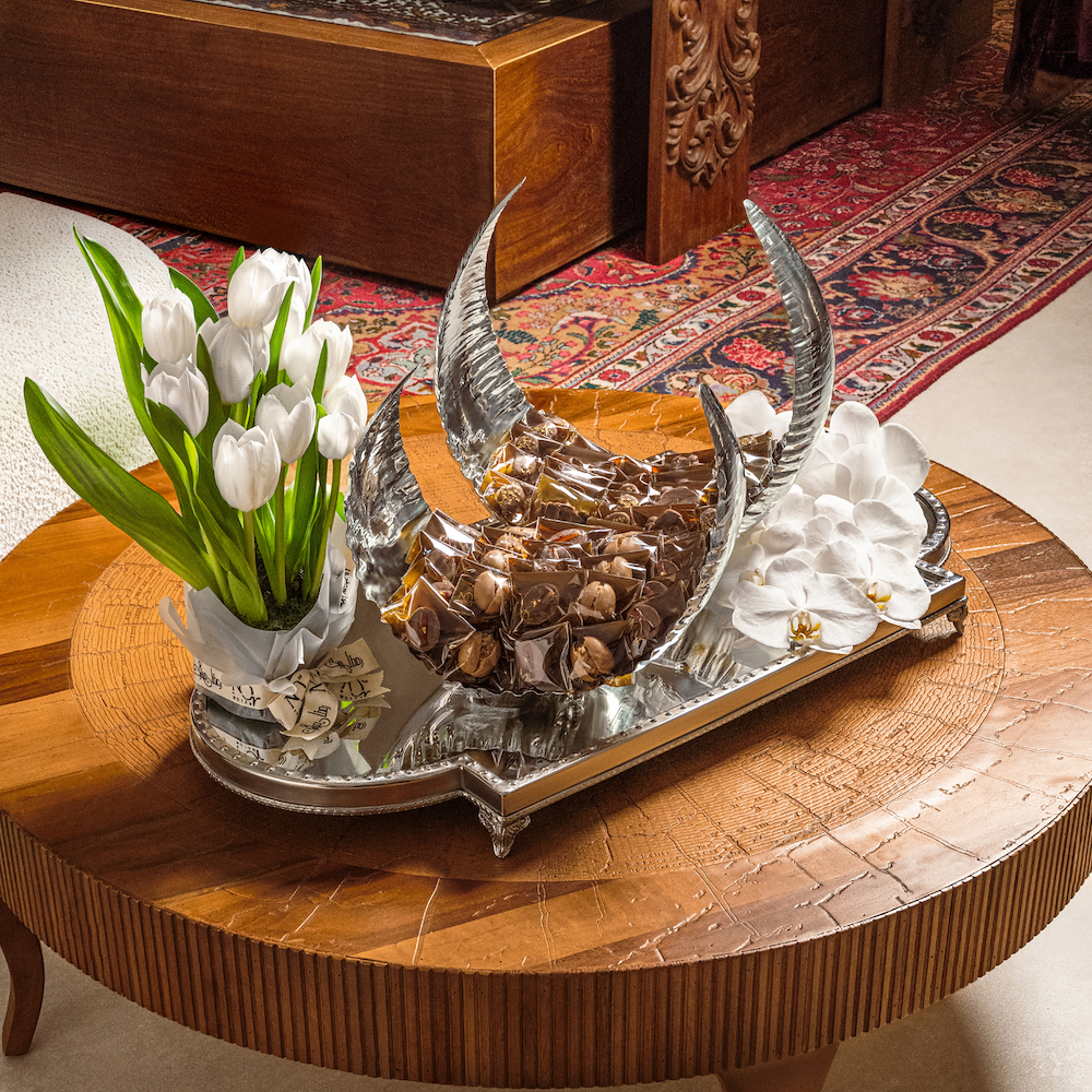 An elegant set displayed on a wooden platter with a metallic stand and a rotating base, featuring a silver Arabic coffee Dalla, five cups, and an assortment of Turtline, Tiger, and Semsemiya chocolates. Quantity: 2.6 kg.