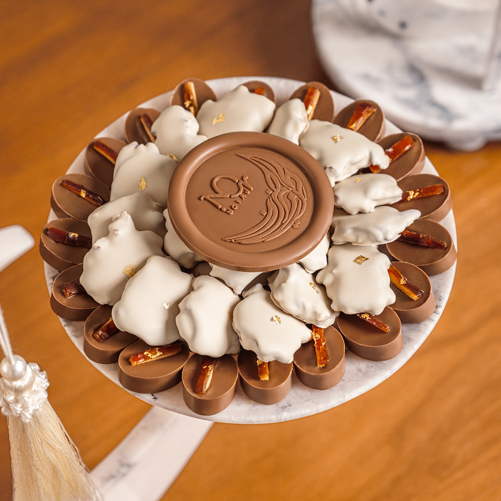 A refined grey crescent accented with a delicate dangling tassel, paired with a matching plate filled with 500 grams of premium chocolate.
