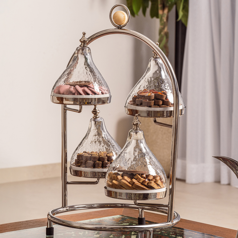 A refined 4-plate serving set, each elegantly covered by a glass dome and filled with a curated selection of tamra and harda, turtline tose, amande, and salted caramel chocolates. Quantity: 1.65 kg. Dimensions: 40 x 60 cm. Each bowl: 15 cm.