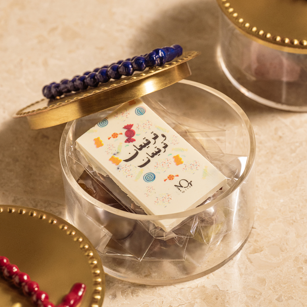 A box featuring 1 slab bar, wrapped chocolate, wrapped nuts, and wrapped marshmallow.
