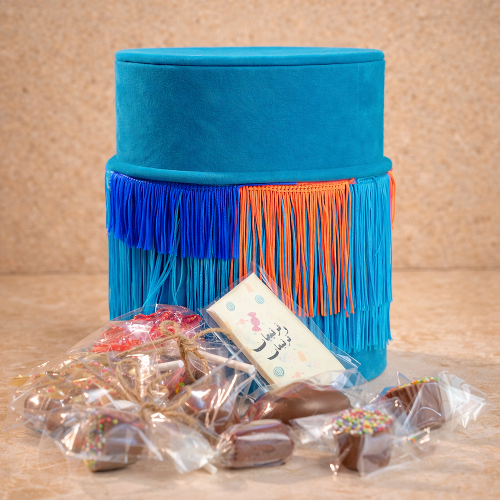 A velvet box with tassel featuring 3 gergaan themed slab bar, chocolate dipped meringues, assorted chocolate pieces, lollipops, fruit rolls, wrapped toffees, and marshmallow pops, available in purple, off white, or blue.