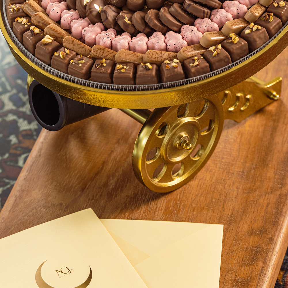 A unique tray, crafted in the iconic shape of the traditional Ramadan Iftar Canon. this centerpiece holds 1.85 kg of premium chocolates, including kinder, pistachio, nutella, and salted caramel.