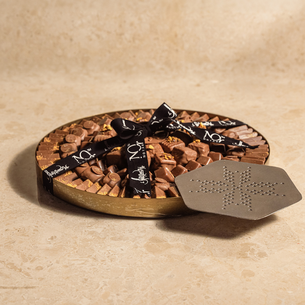 Antique brass-finish box filled with 1.5 kg of our signature unwrapped chocolates, featuring fostoga dulcey, pravé, and crunchy caramel. Includes an “Eid Mubarak” chocolate card.