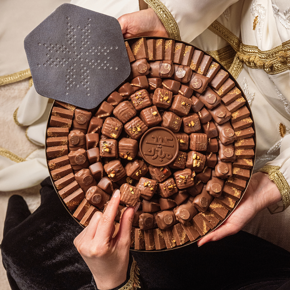 Antique brass-finish tray filled with 1.2 kg of our best-selling unwrapped chocolates. Includes an “Eid Mubarak” chocolate card.