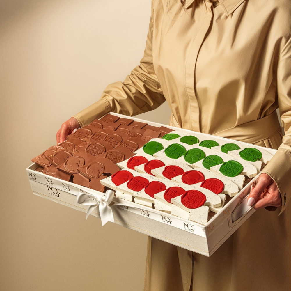 A refined selection of 40 Kuwait map shaped chocolate slab pieces, finished with a rich caramelized pecan flavor.