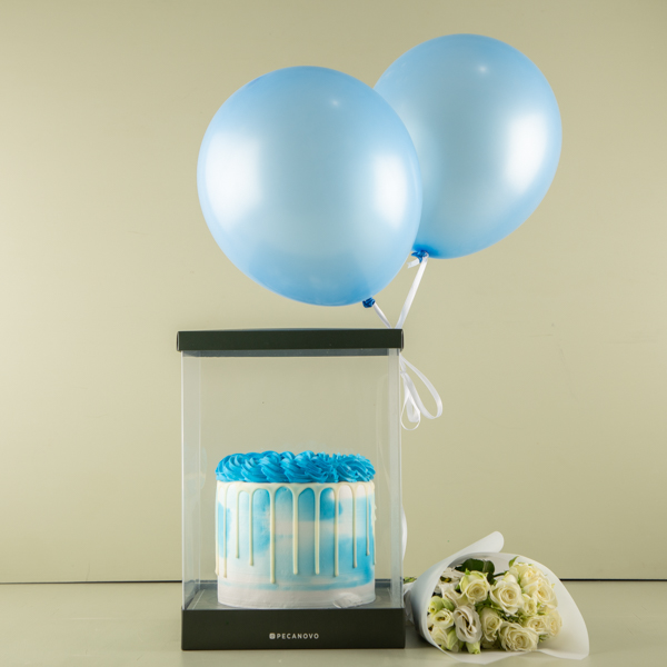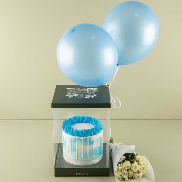 A vanilla soft cream cake decorated in pastel blue color and a flower hand bouquet with separate balloon. You can choose red velvet or chocolate flavor, please mention in extra details.