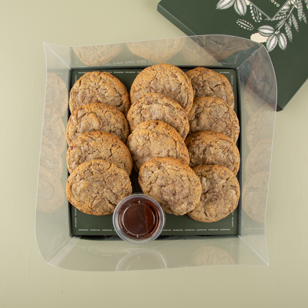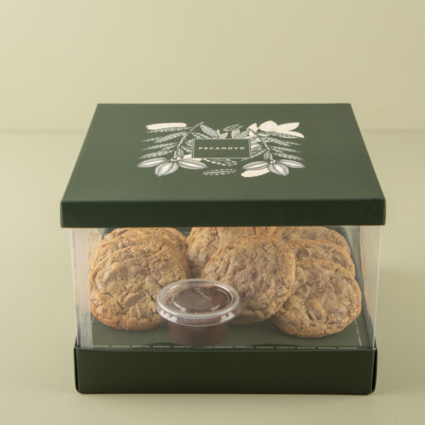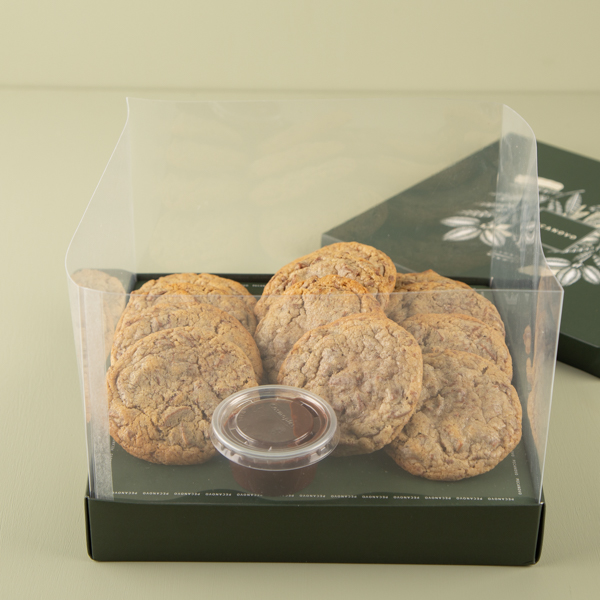 12 pcs, 50 grams each chocolate cookies with chocolate sauce on the side.