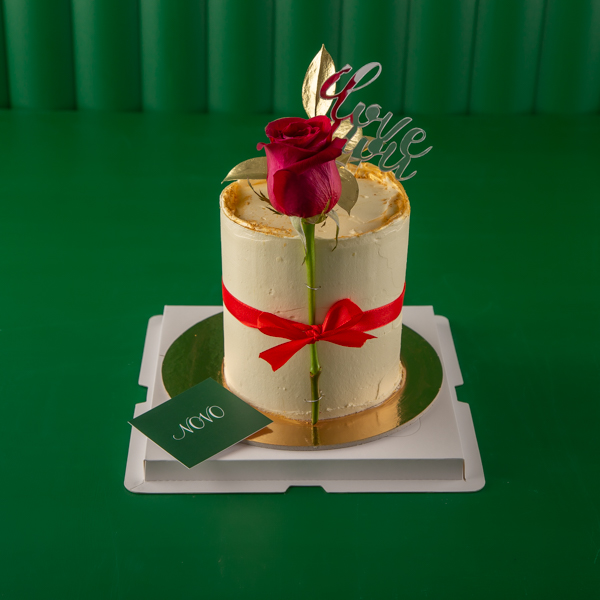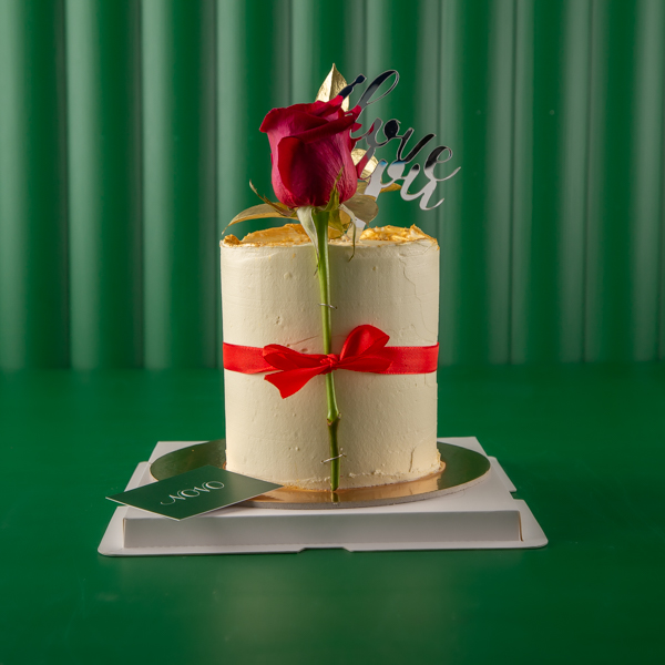 A butter frosting cake decorated with big red rose including a love topper.