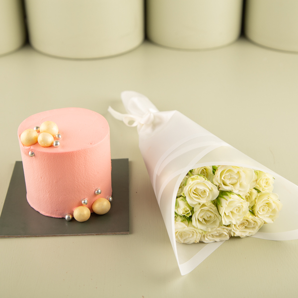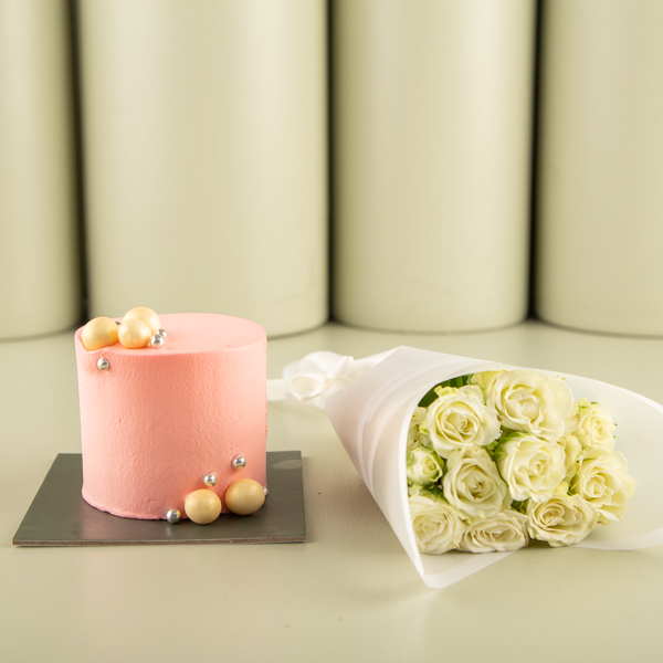 A soft cream cake decorated with chocolates and chocolate balls with flowers hand bouquet.