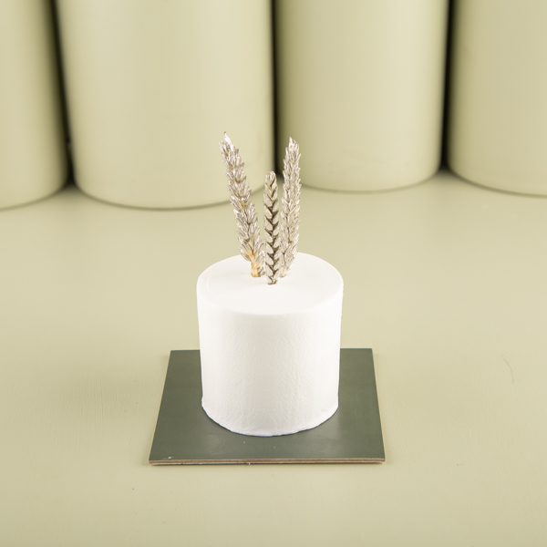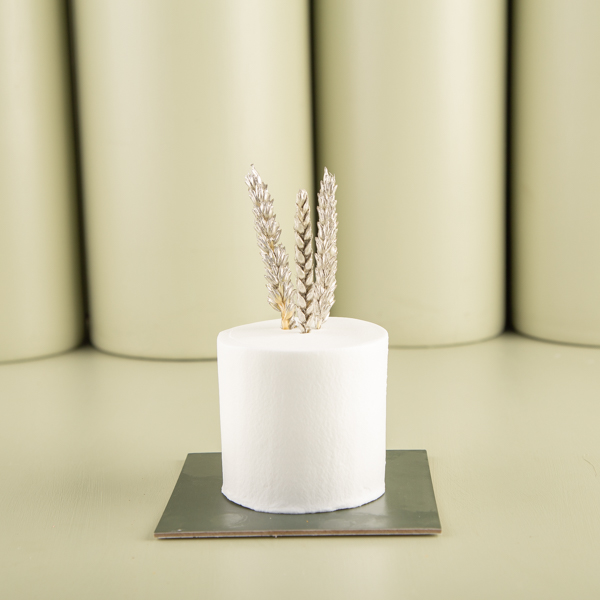 A soft cream cake decorated with dried wheat.