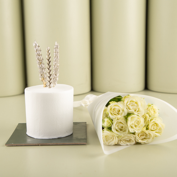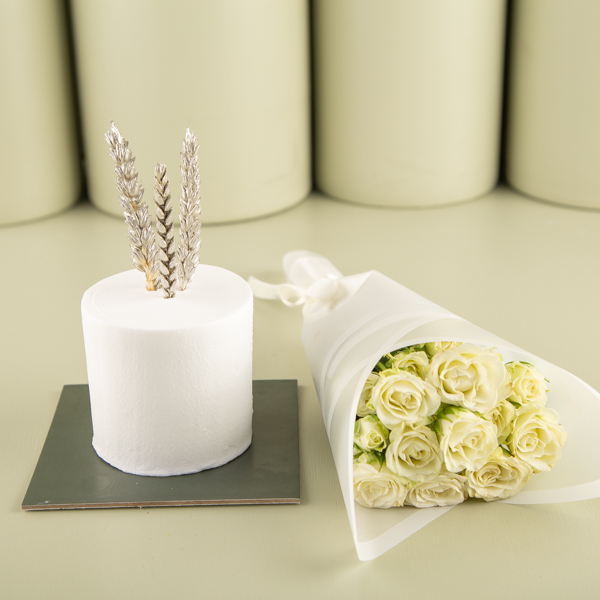 A soft cream cake decorated with dried wheat with flower hand bouquet.