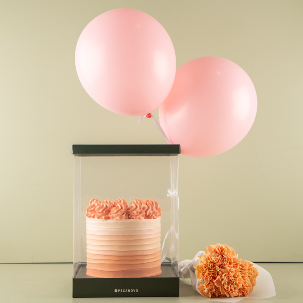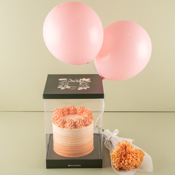 A vanilla soft cream cake decorated in three peach color combination with a flower hand bouquet and separate balloon. You can choose red velvet or chocolate flavor, please mention in extra details.