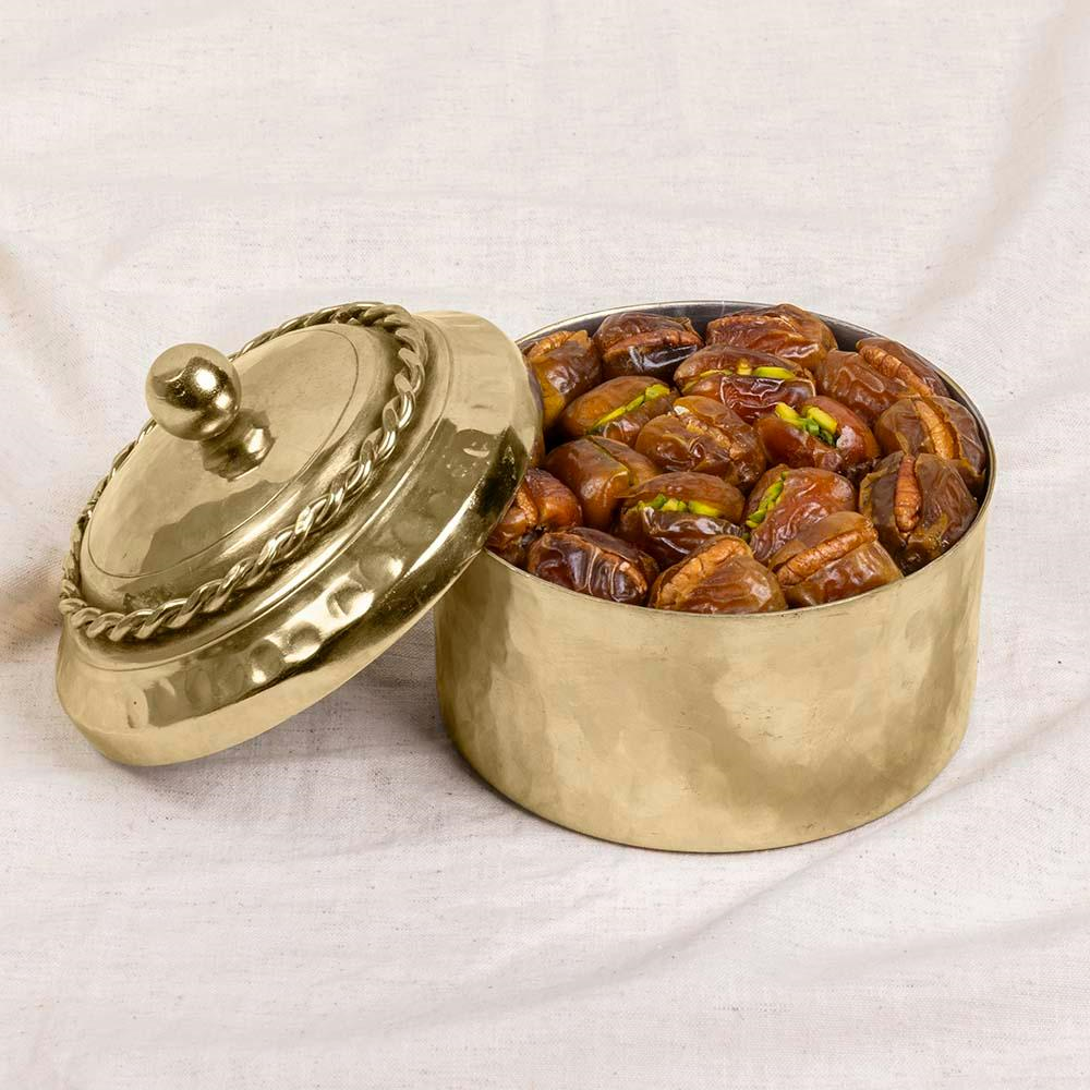 Sagai dates stuffed with nuts, elegantly presented in a golden bowl for a luxurious treat.