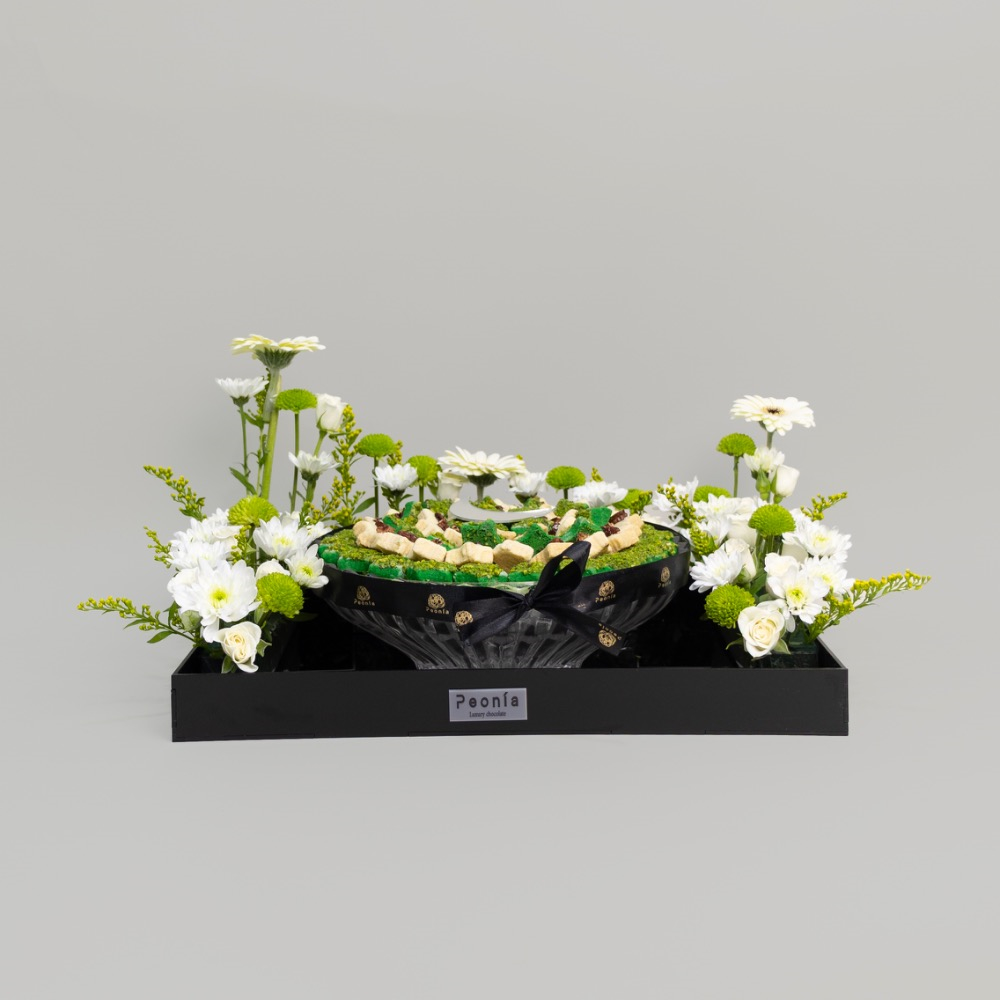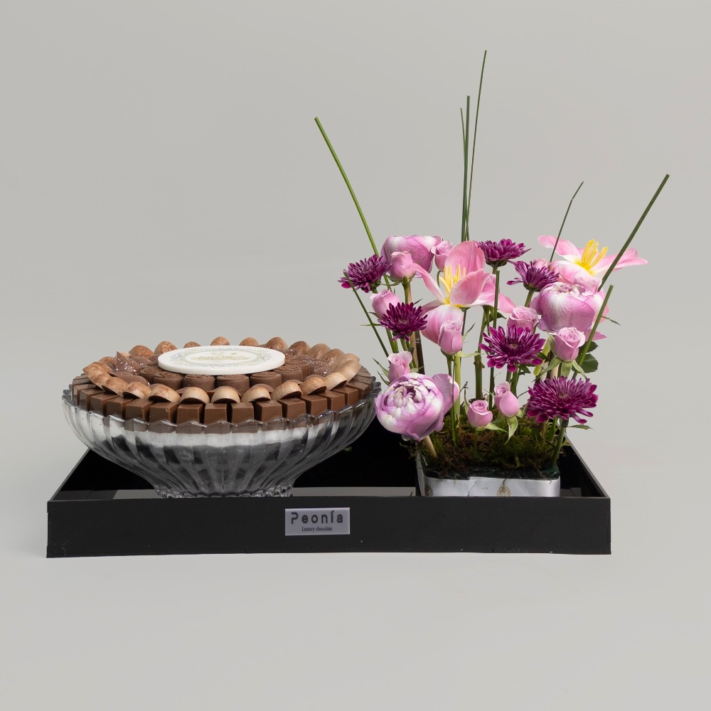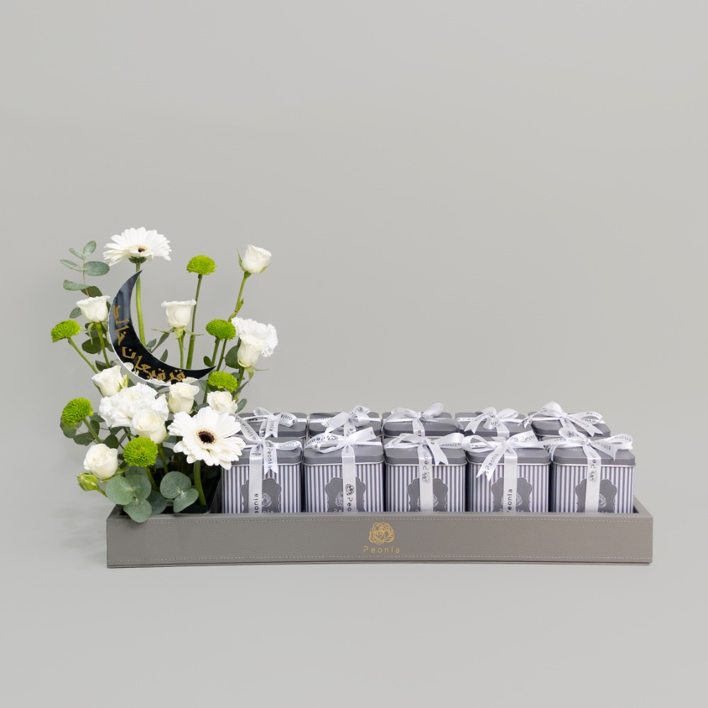 A leather tray containing 10 elegant metal boxes for Gergeaan with luxurious French chocolates in various fillings and natural roses. The writing on the crescent can be customized.