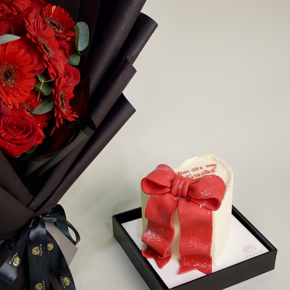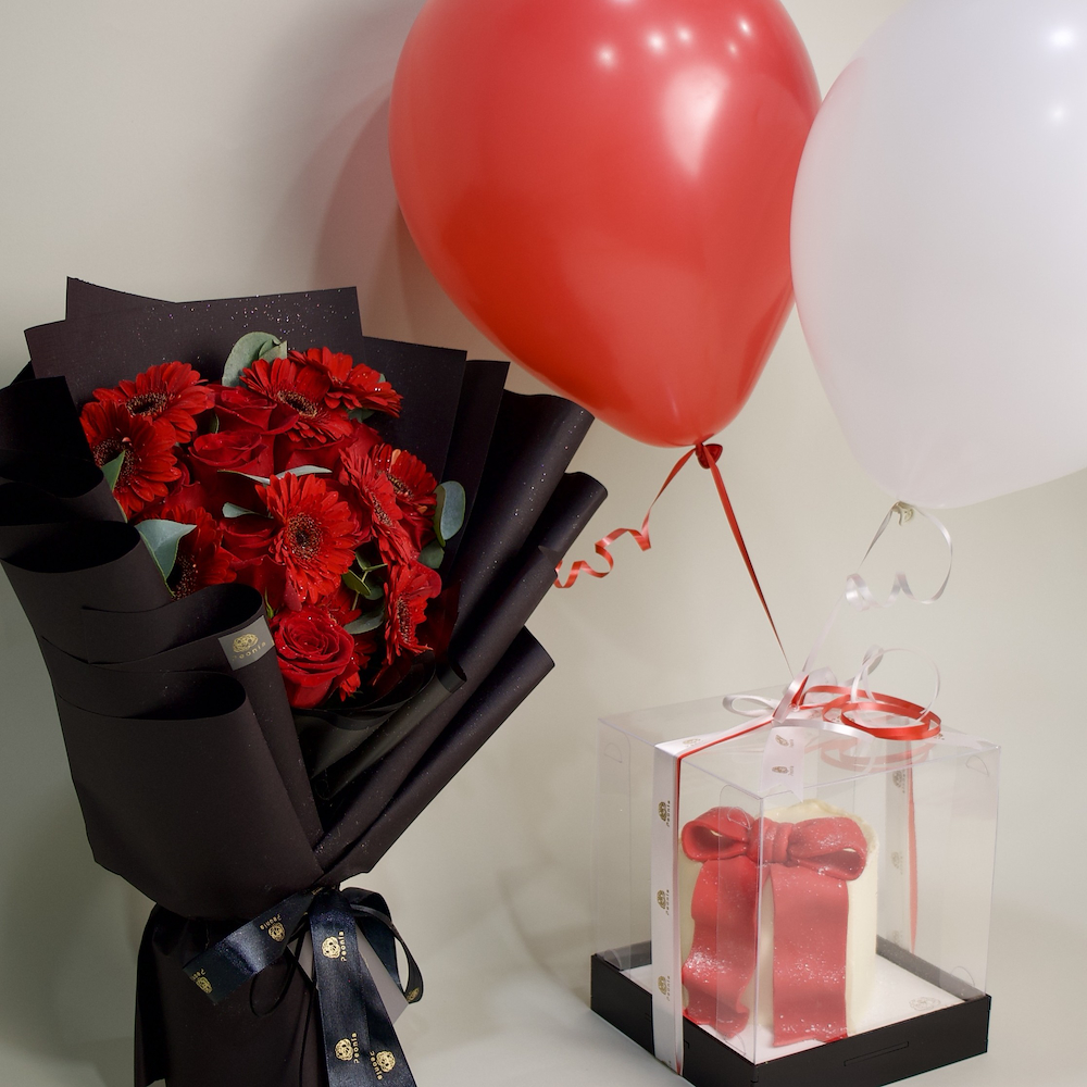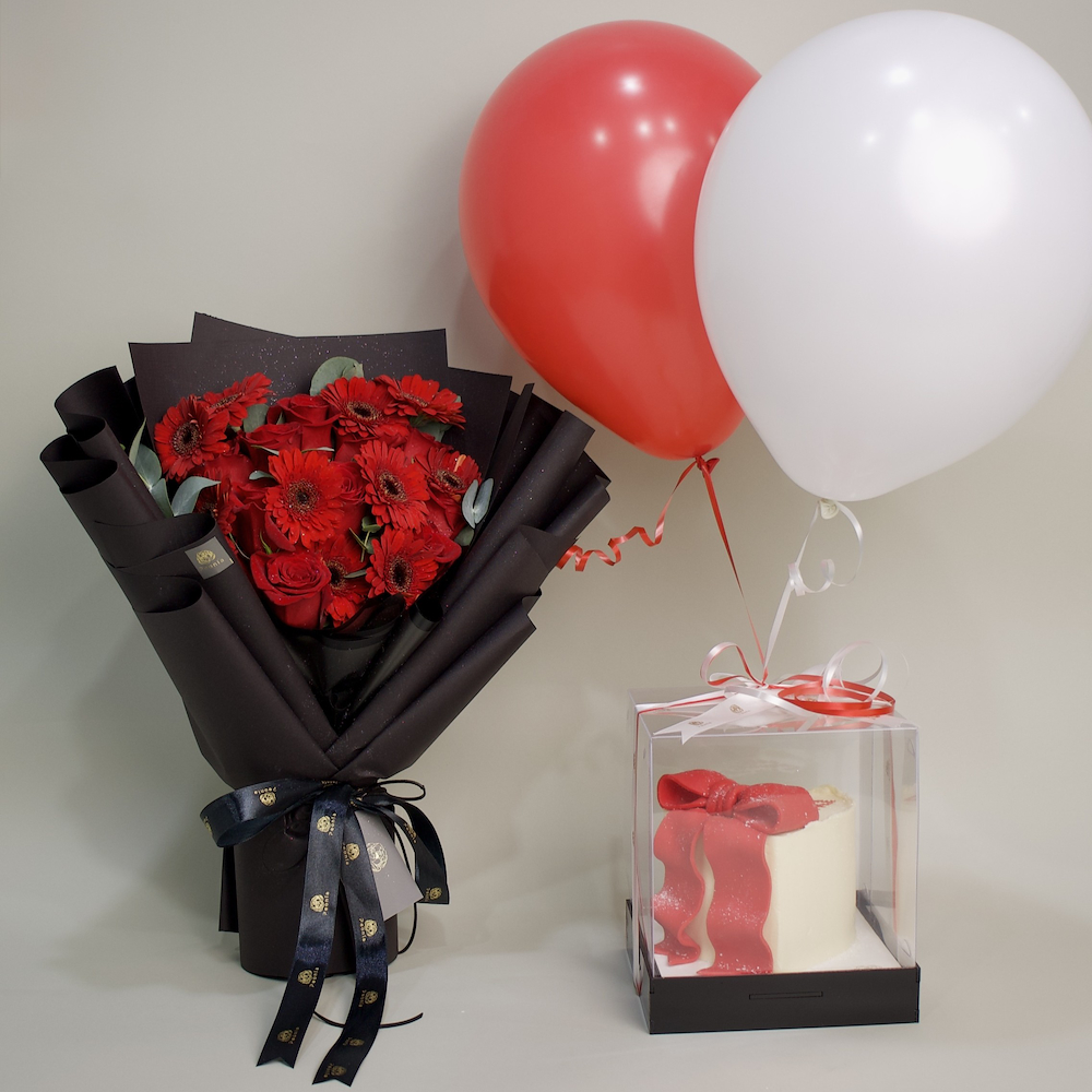 A 5-inch chocolate and vanilla cake, beautifully decorated with natural red flowers and balloons, making it a sweet gift for Love Day.