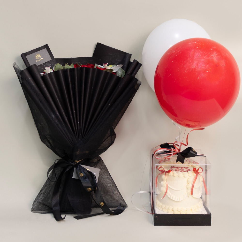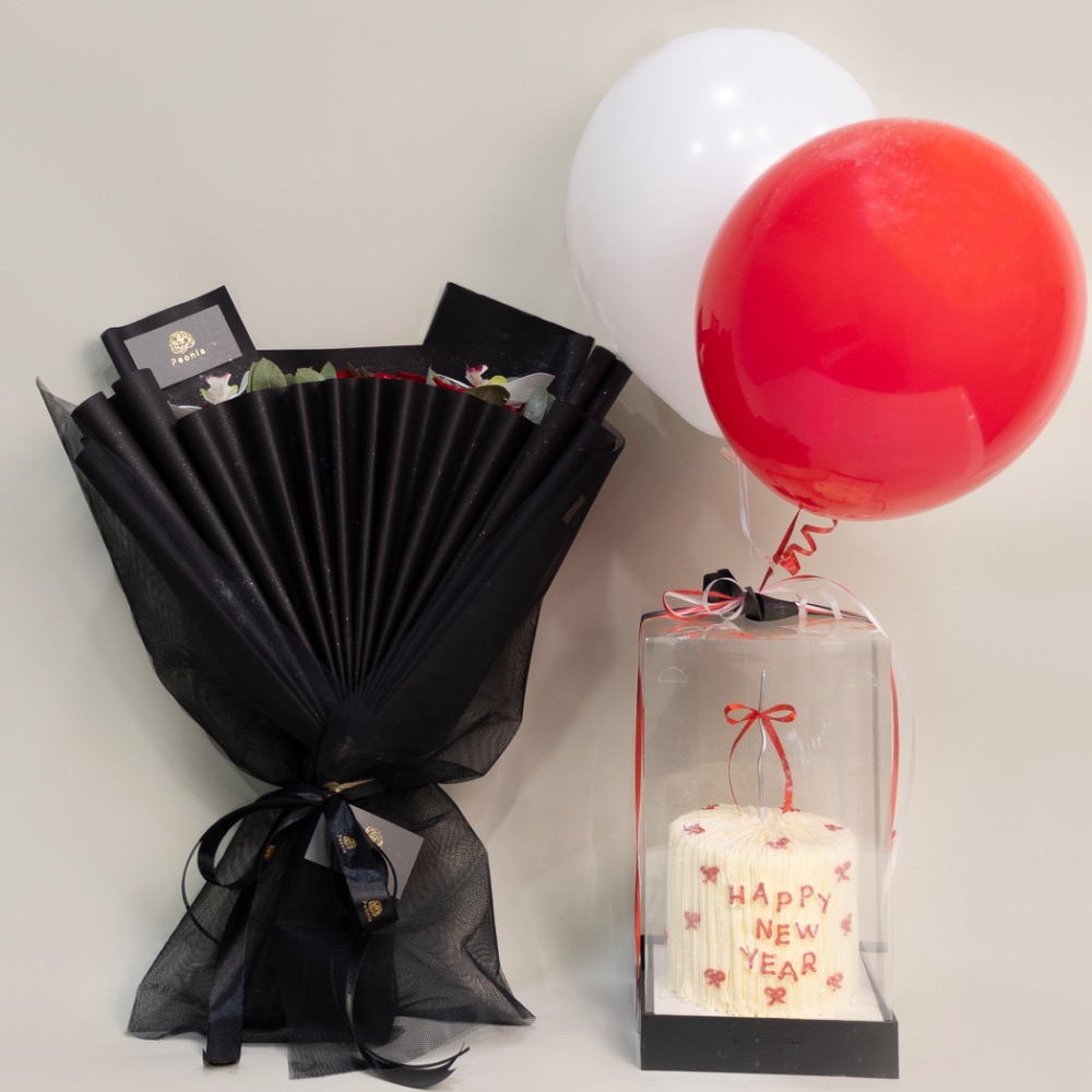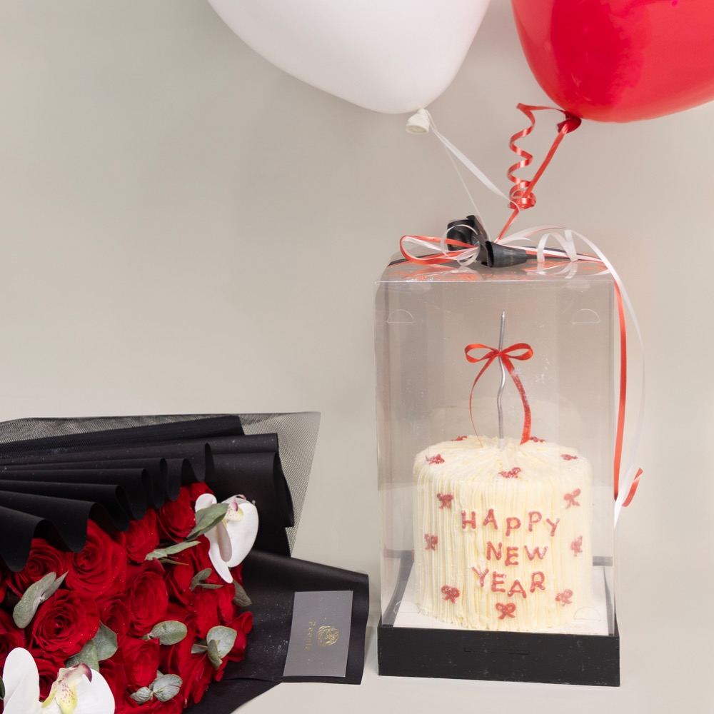 A set of a cake, balloons, and a hand bouquet of red roses for the New Year. The cake flavor is mixed chocolate and vanilla.