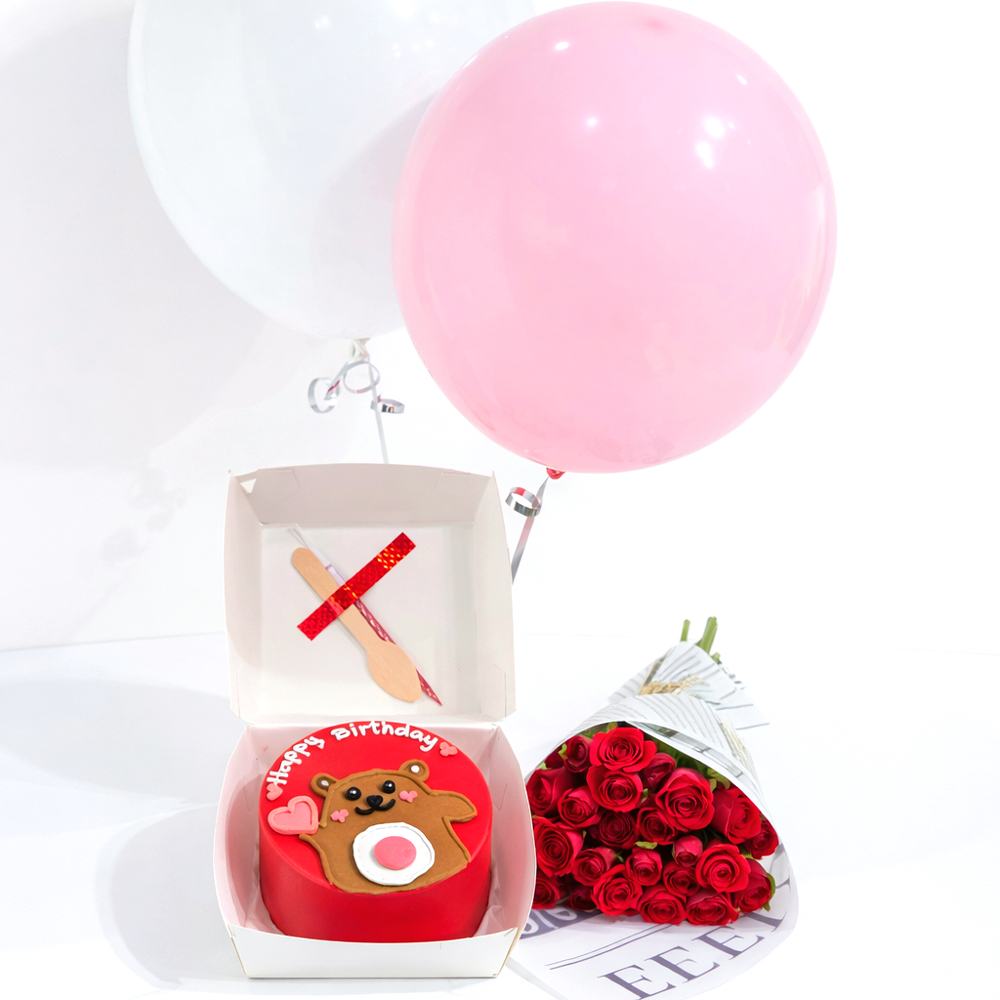 A 4-inch bento cake serves 2 people with a spoon, a candle, 2 helium balloons, and a small flower bouquet. The flavors are chocolate or vanilla.