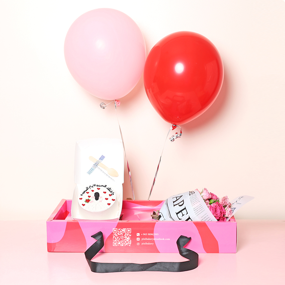 A cheerful pink tray arranged with a bento cake and a mini flower bouquet decorated with balloons.