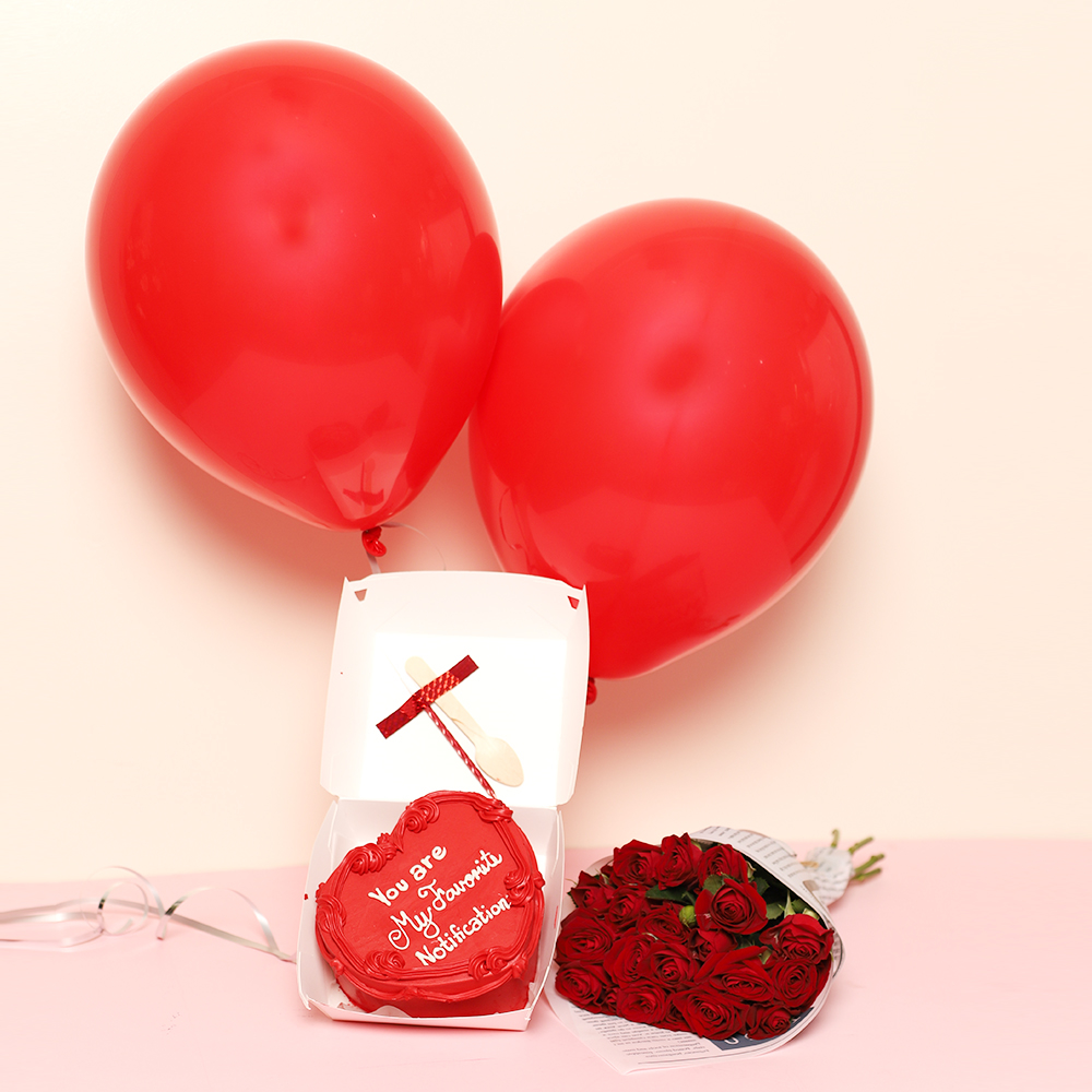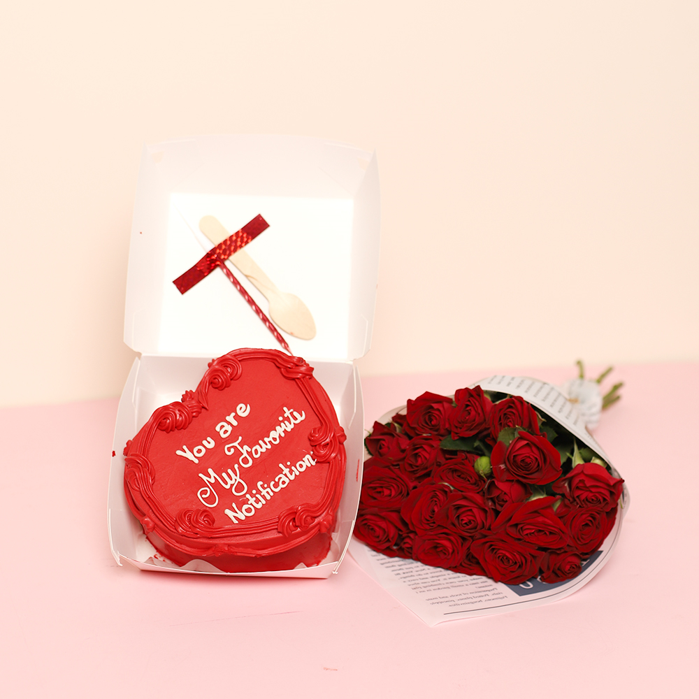 A heart-shaped bento cake, with our signature Love Day combo with beautiful roses and 2 balloons. This petite, heart-shaped vanilla sponge is coated in silky buttercream and hand-piped with a classic romantic message. Perfectly sized for two, it comes tucked in a sustainable lunchbox with a wooden spoon and a candle, ready for a surprise date night or a thoughtful delivery.