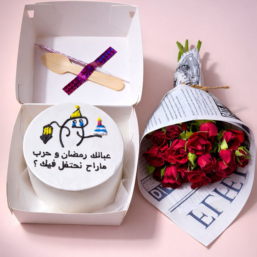 A bento cake in4 inch serves 2 people, with a spoon, a candle and a small bunch of baby roses.