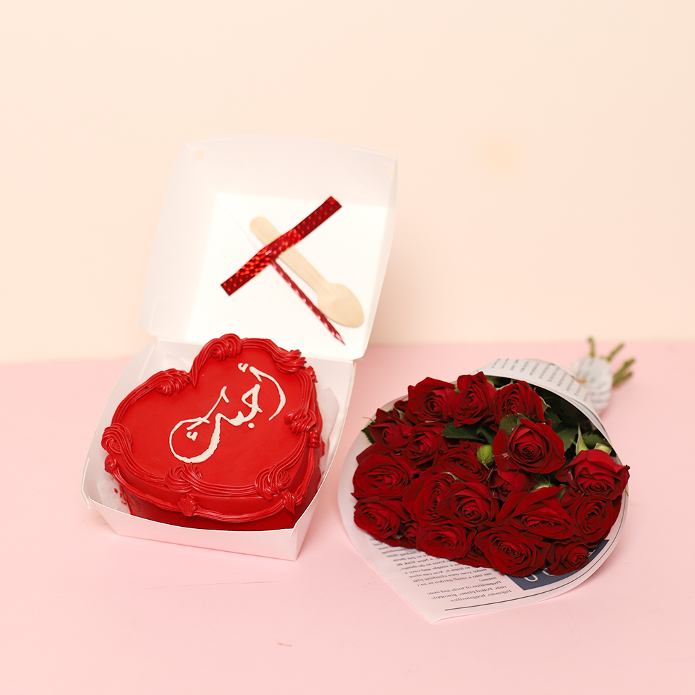 A heart-shaped bento cake, with our signature Love Day combo with beautiful roses and 2 balloons. This petite, heart-shaped vanilla sponge is coated in silky buttercream and hand-piped with a classic romantic message. Perfectly sized for two, it comes tucked in a sustainable lunchbox with a wooden spoon and a candle, ready for a surprise date night or a thoughtful delivery.