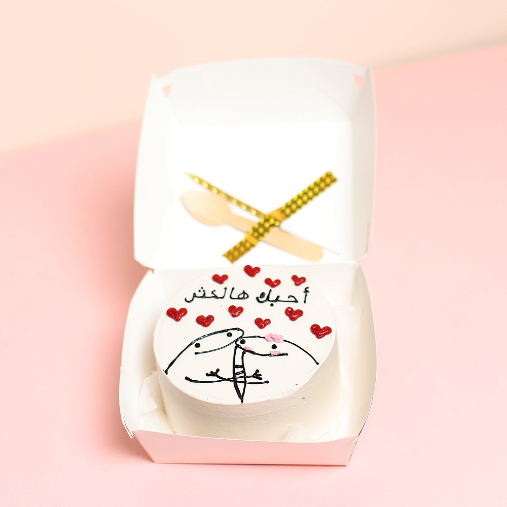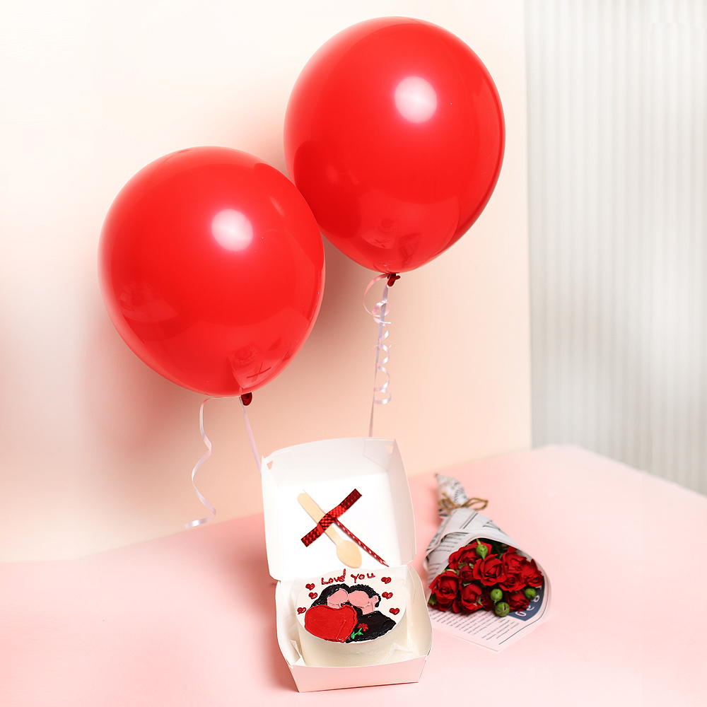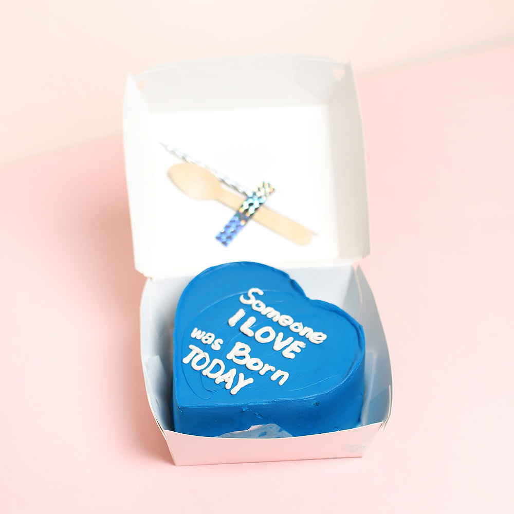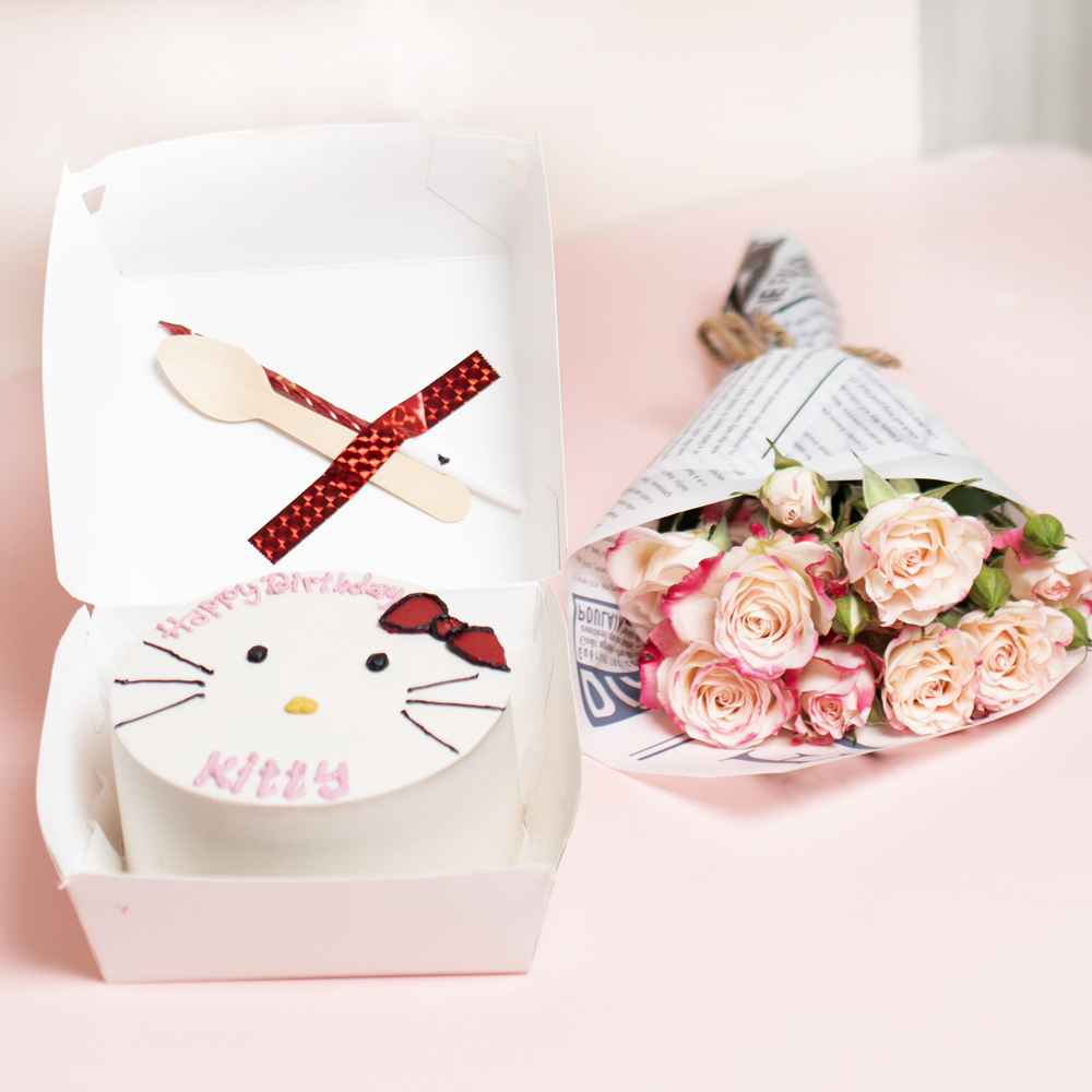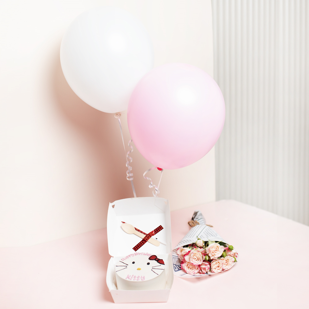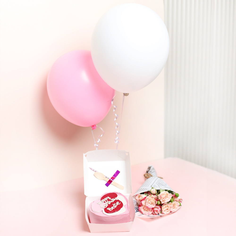 A 4-inch chocolate and vanilla bento cake with a flower bouquet, a small wooden spoon, 2 balloons, and a candle.