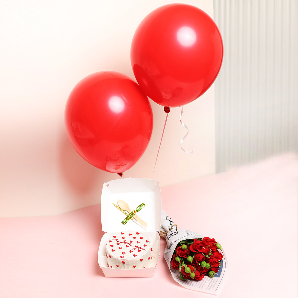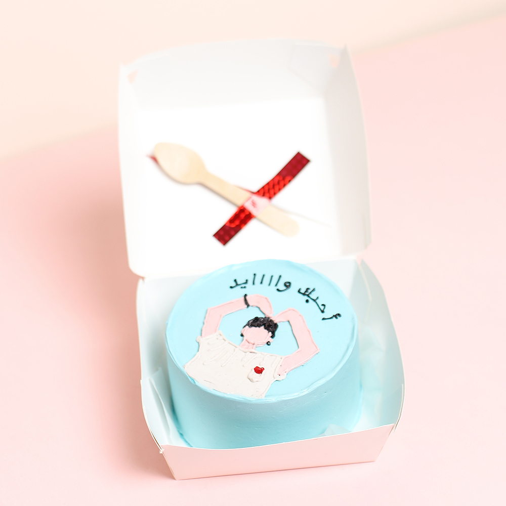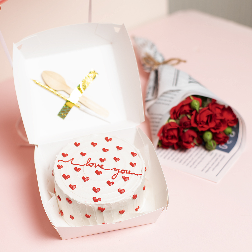 A 4 inch bento cake for 2 persons with a mini flower bouquet 2 balloons a spoon and a candle.