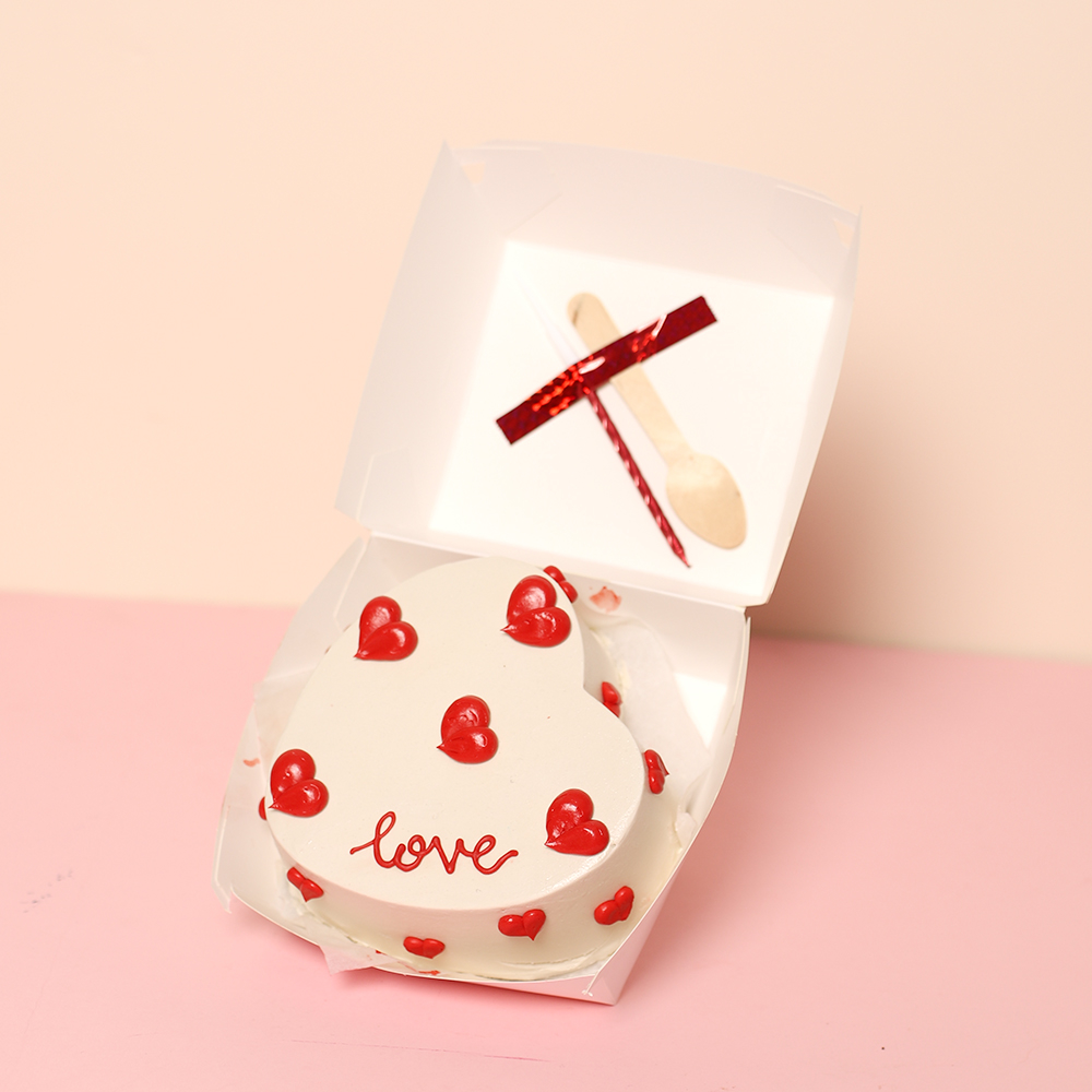 A love letter you can actually eat. This adorable 4-inch bento cake is frosted in dreamy white buttercream and decorated with festive red hearts. It’s the perfect "just because" gift to make someone’s Love Day extra sweet. This set includes a travel-friendly bento box, a sustainable wooden spoon, and a candle to light up your Love moment.