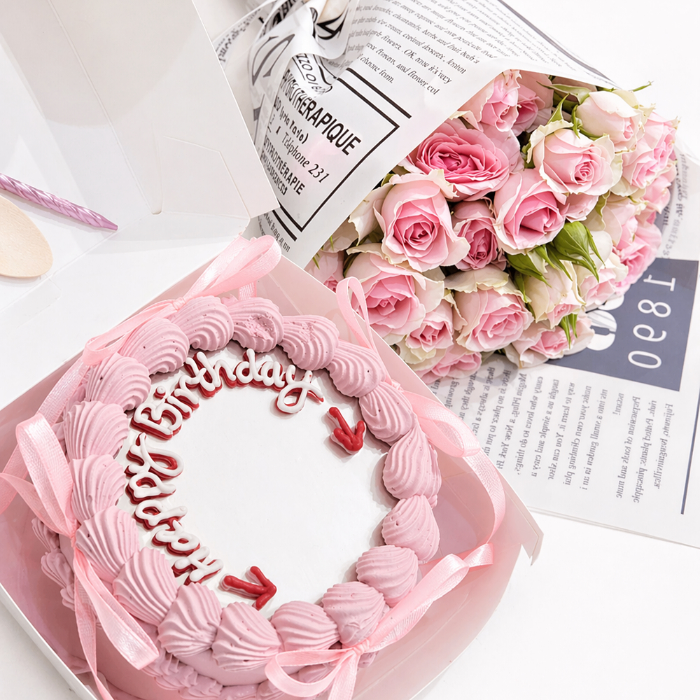 A bento cake in 4-inch serves 2 people with a spoon, a candle, 2 helium balloons and a small flower bouquet.