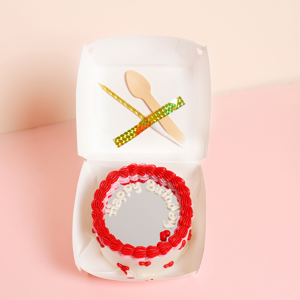 A 4-inch chocolate and vanilla bento cake with a small wooden spoon and a candle.
