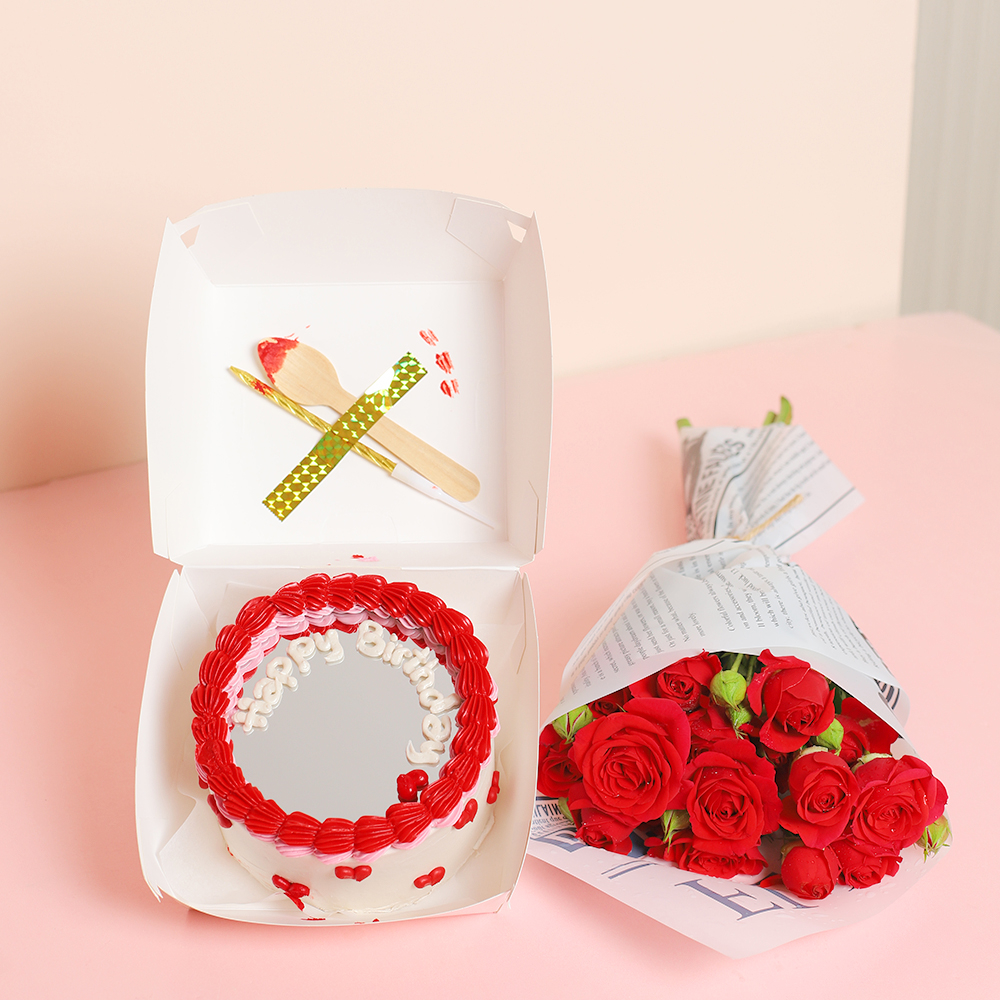 A 4 inch bento cake for 2 persons with a mini flower bouquet, balloons, a spoon, and a candle.
