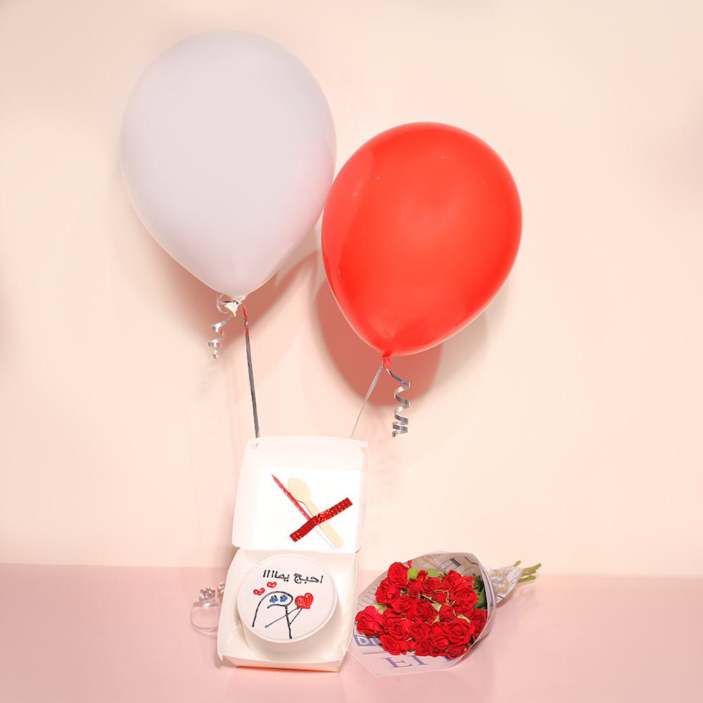 A bento cake in 4 inch serves 2 people with a spoon, a candle, 2 helium balloons and a small flower bouquet.