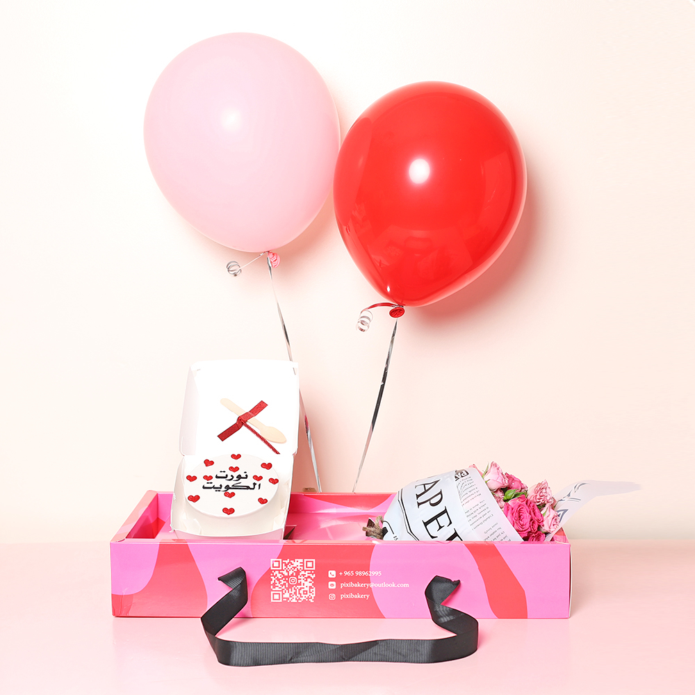A cheerful pink tray arranged with a bento cake and a mini flower bouquet decorated with balloons.