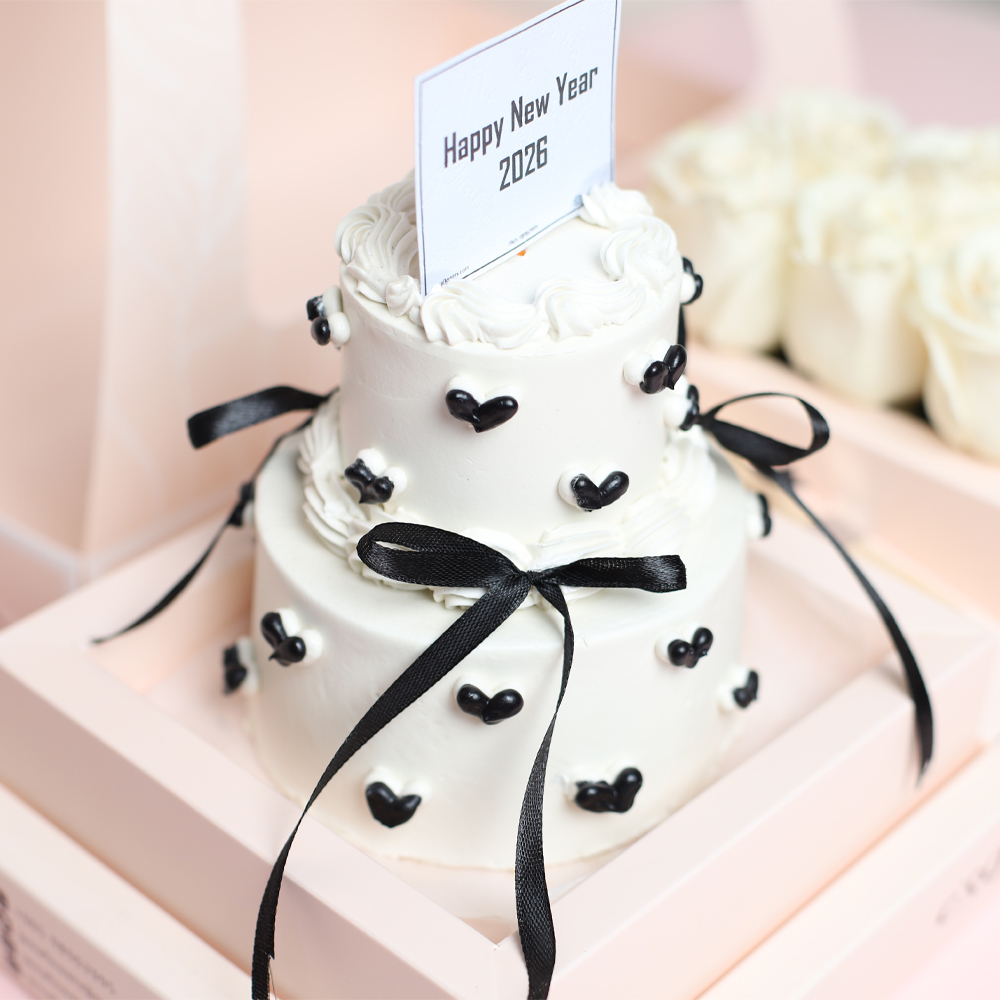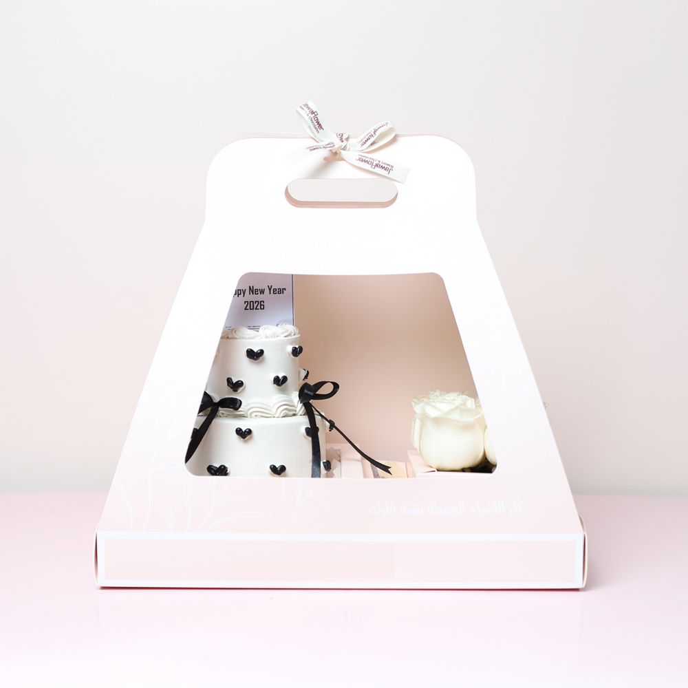 A 2-layer cake with flowers and 2 balloons with a customized card in an elegant gift box with a spoon and a candle.