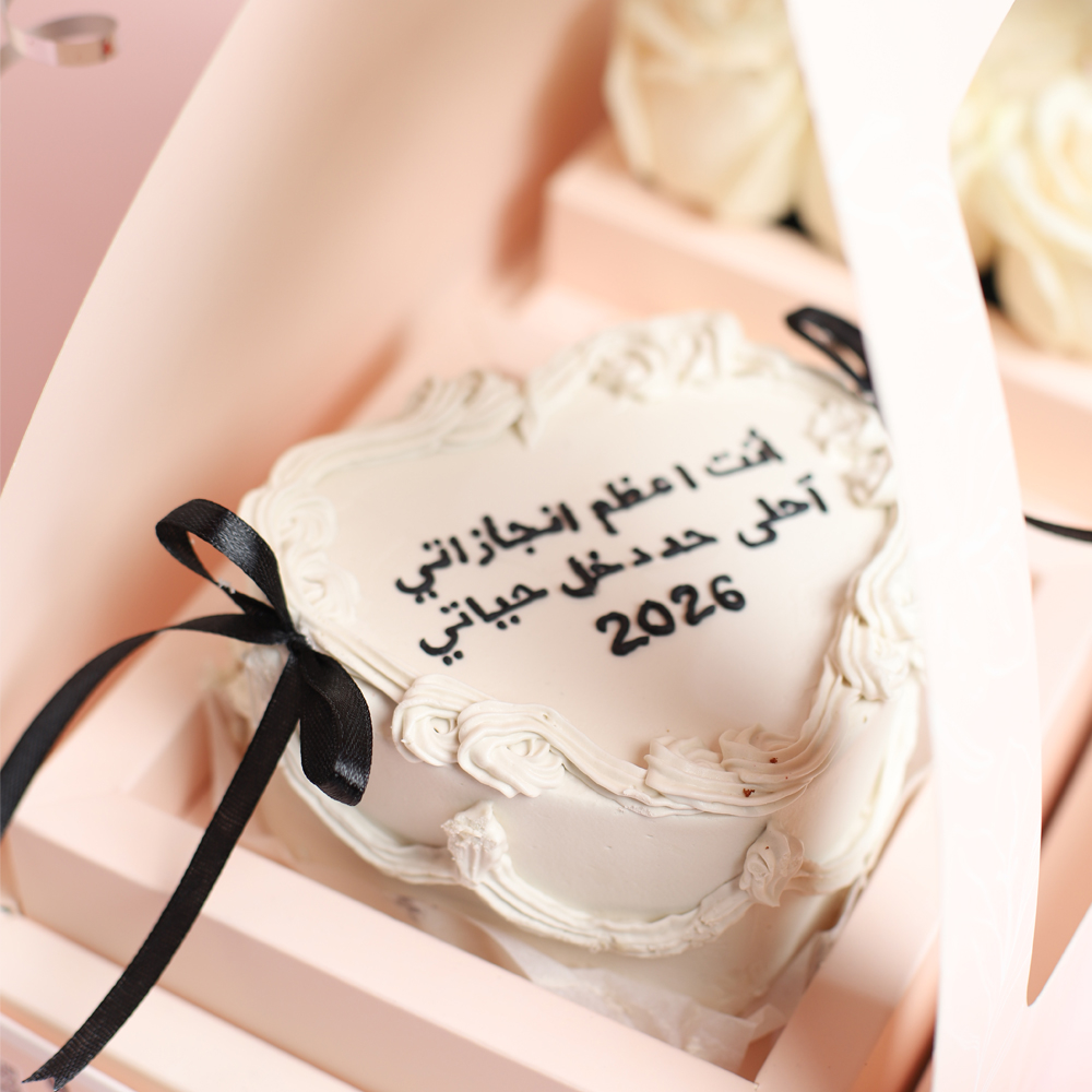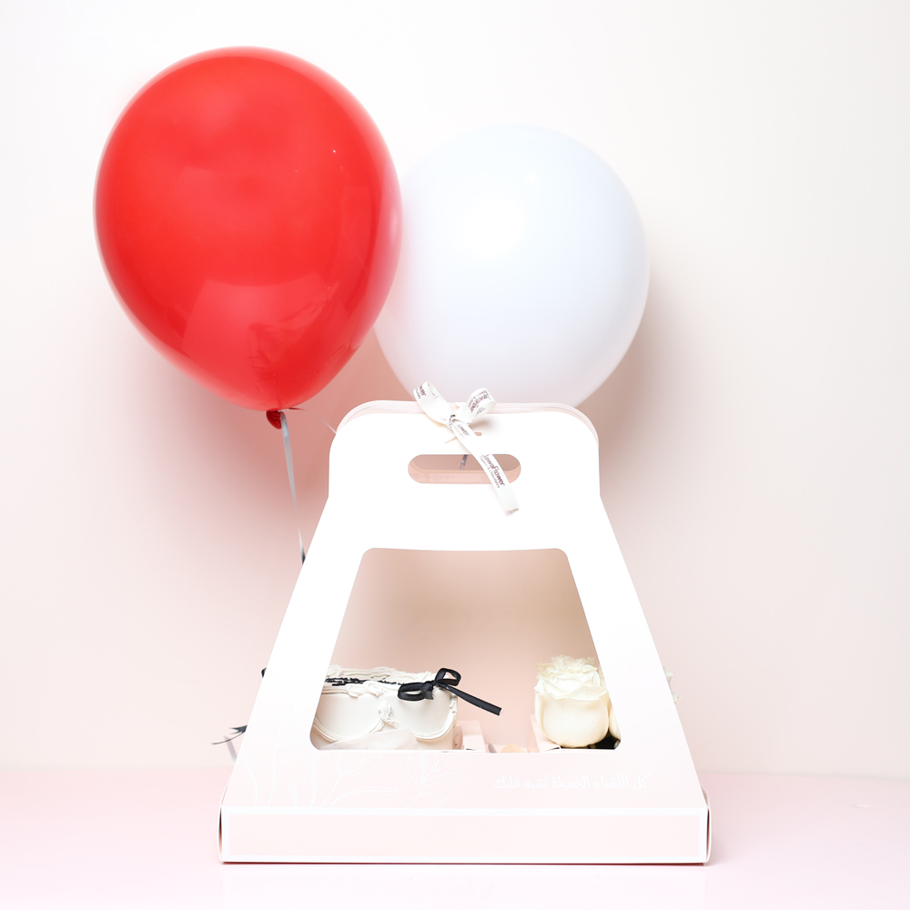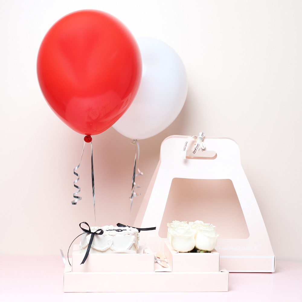 A heart-shaped cake with flowers and 2 balloons with a customized card in an elegant gift box with a spoon and a candle.