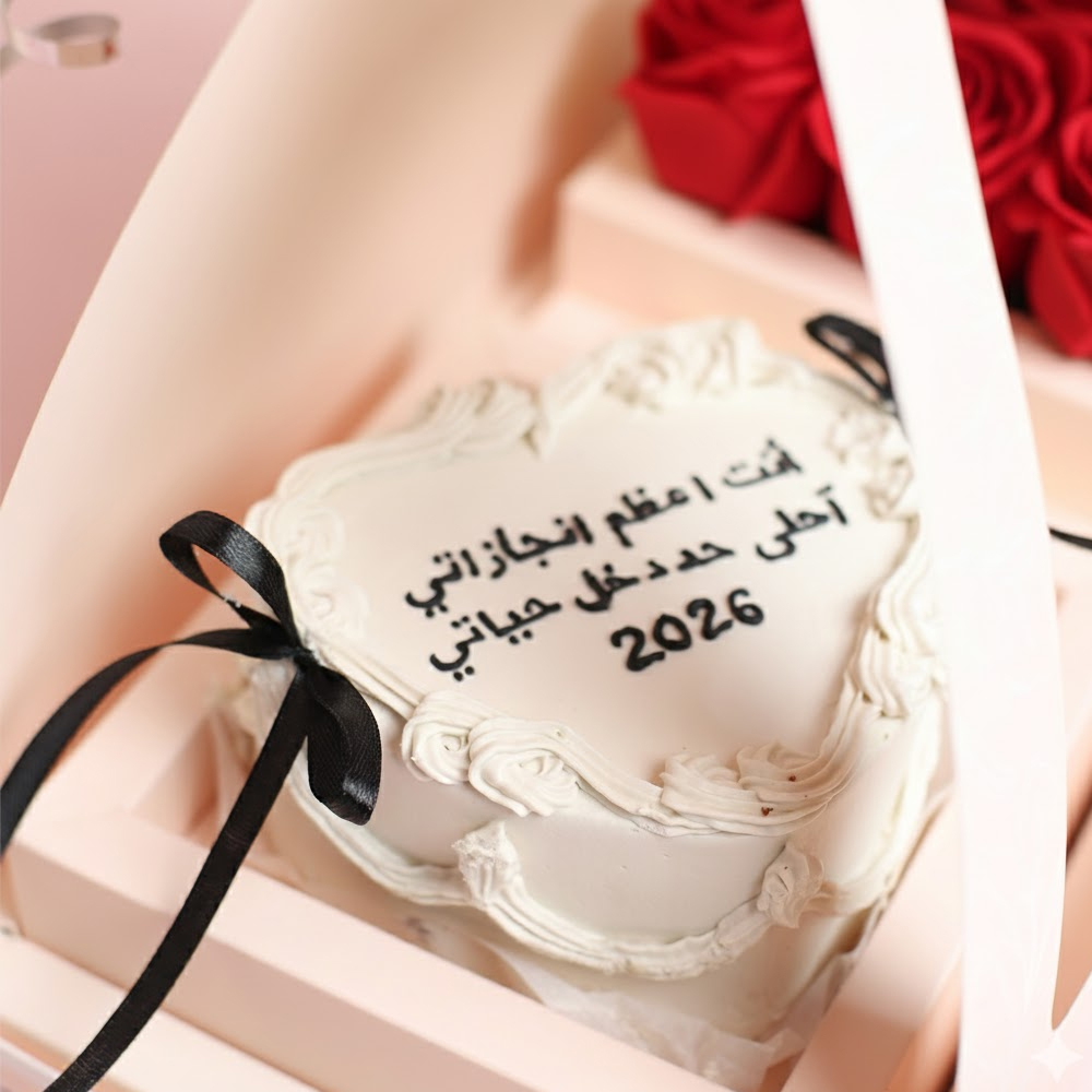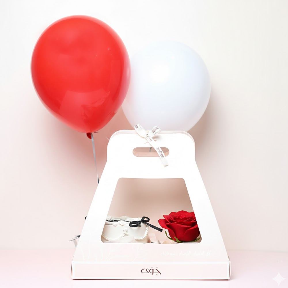 A heart-shaped cake with flowers and 2 balloons with a customized card in an elegant gift box with a spoon and a candle.