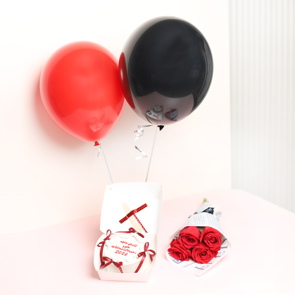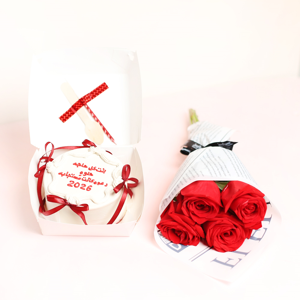 A new year bento cake featuring a small red rose hand bouquet and two balloons in a minimalist style, packaged in a classic eco friendly lunchbox with a wooden spoon and a candle included.
