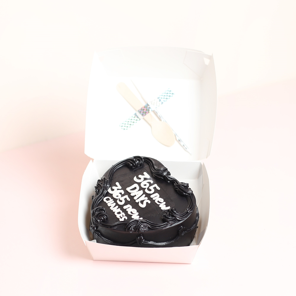 A new year bento cake packaged in a classic eco friendly lunchbox with a wooden spoon and a candle included, with the writing 365 new days.