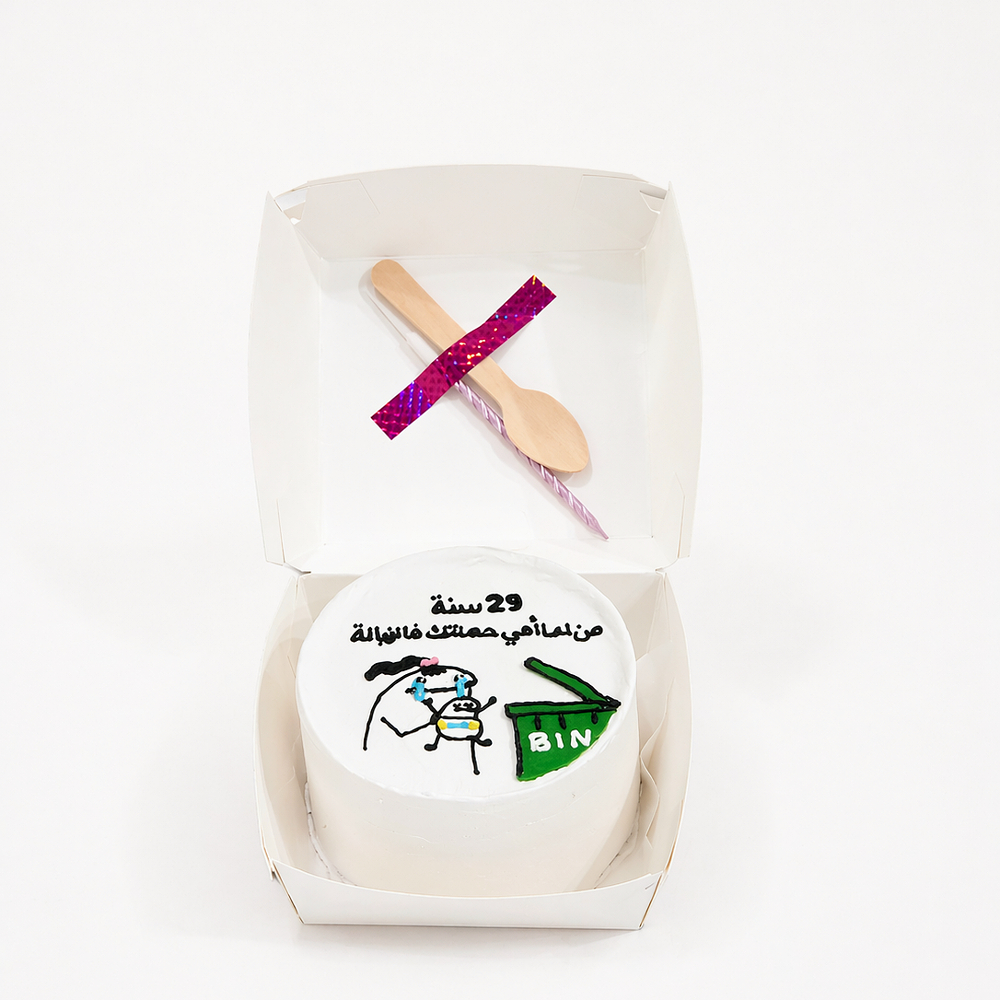 A 4-inch chocolate and vanilla bento cake that serves 2 people with a small wooden spoon and a candle.