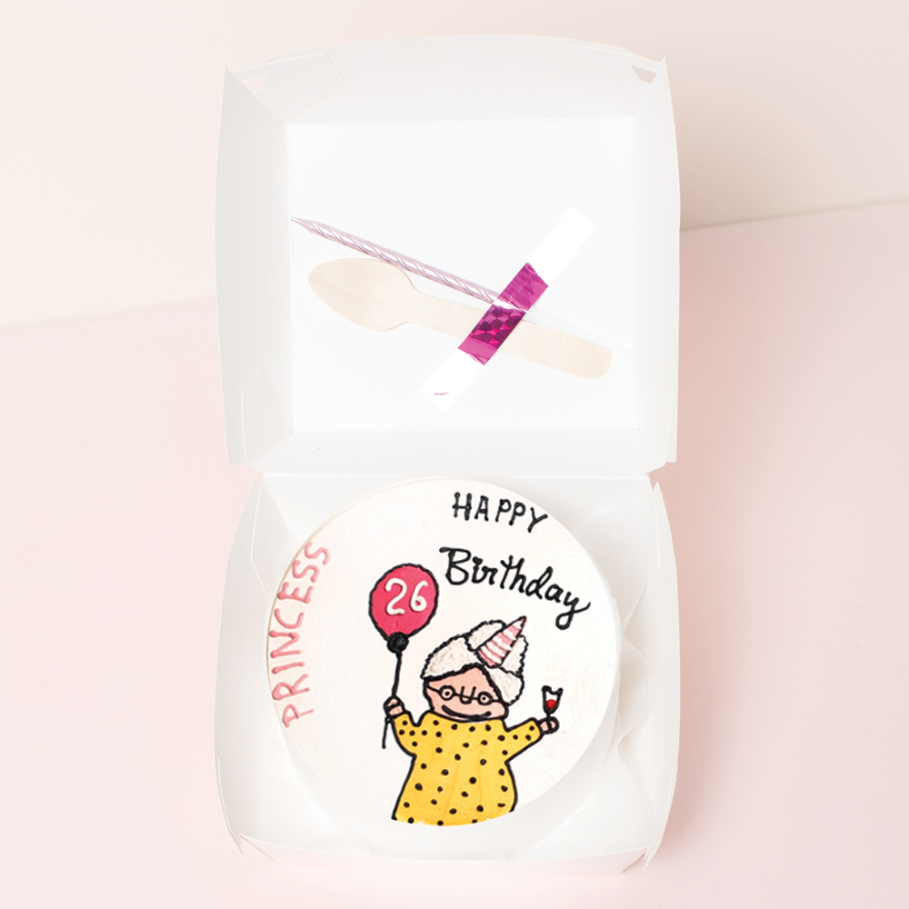 A 4-inch bento cake with your choice of vanilla or chocolate flavor. Enough for 2 people and comes with a spoon and a candle.