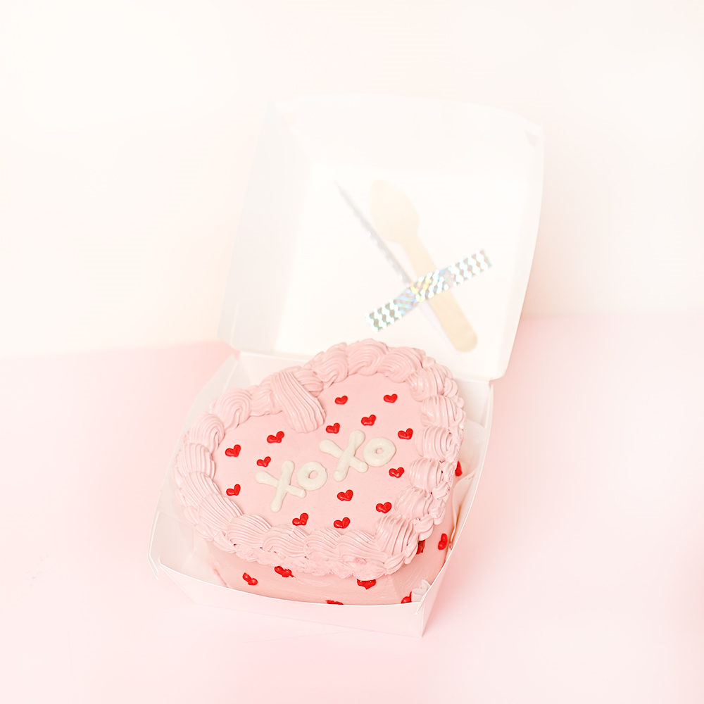 A love letter you can actually eat. This adorable 4-inch bento cake is frosted in dreamy pink buttercream and decorated with festive red hearts. It’s the perfect "just because" gift to make someone’s Valentine’s Day extra sweet. This set includes a travel-friendly bento box, a sustainable wooden spoon, and a candle to light up your Valentine's moment