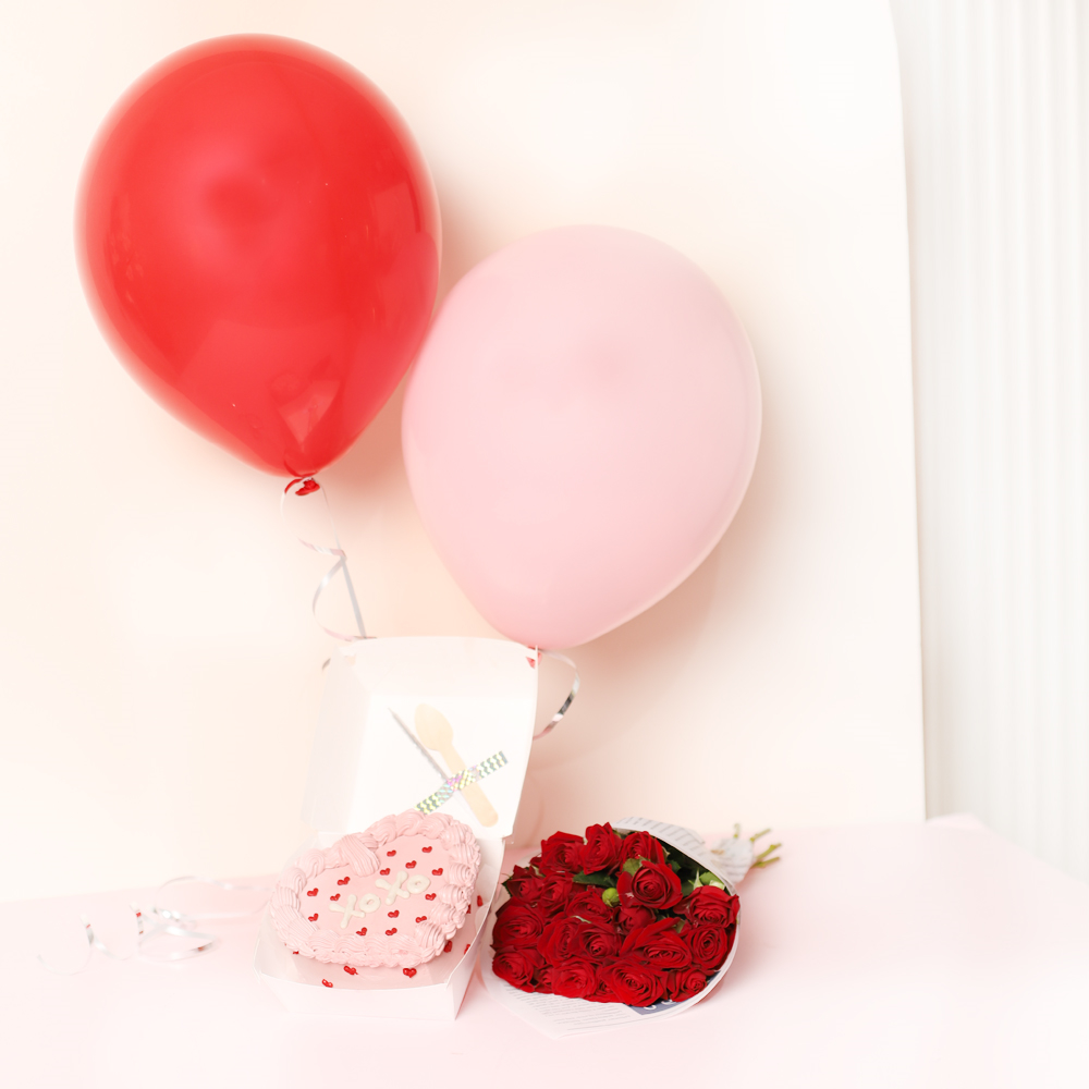 Elevate your surprise with our all-in-one Love Day bundle. This curated set includes our signature pink "XOXO" vintage heart bento cake, a stunning hand-tied bouquet of fresh red roses, and a festive duo of red and pink balloons. It’s a complete romantic experience delivered straight to their door. Includes bento box, candle, and sustainable wooden spoon.