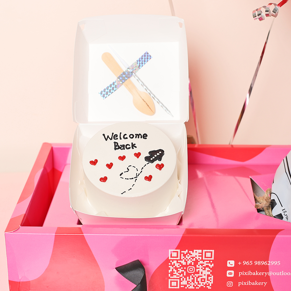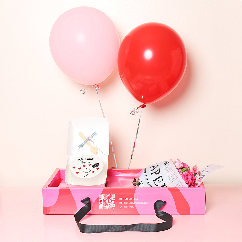 A cheerful pink tray arranged with a bento cake and a mini flower bouquet decorated with balloons.