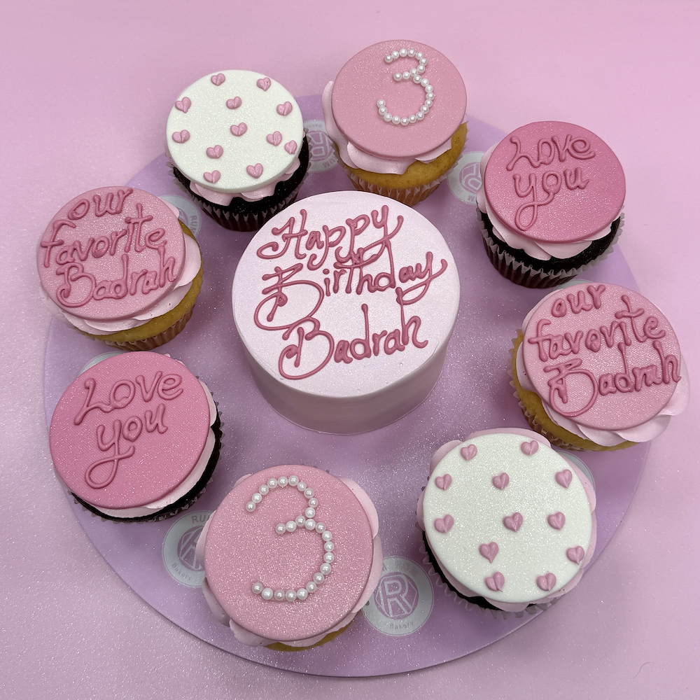 A mini cake with 8 cupcakes in chocolate and vanilla flavors. name and age is customizable.