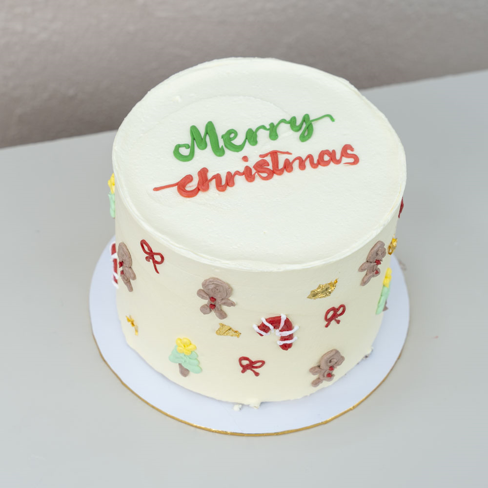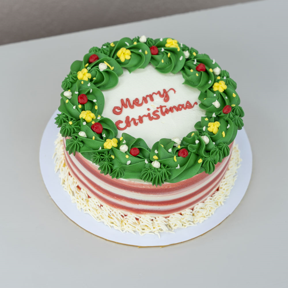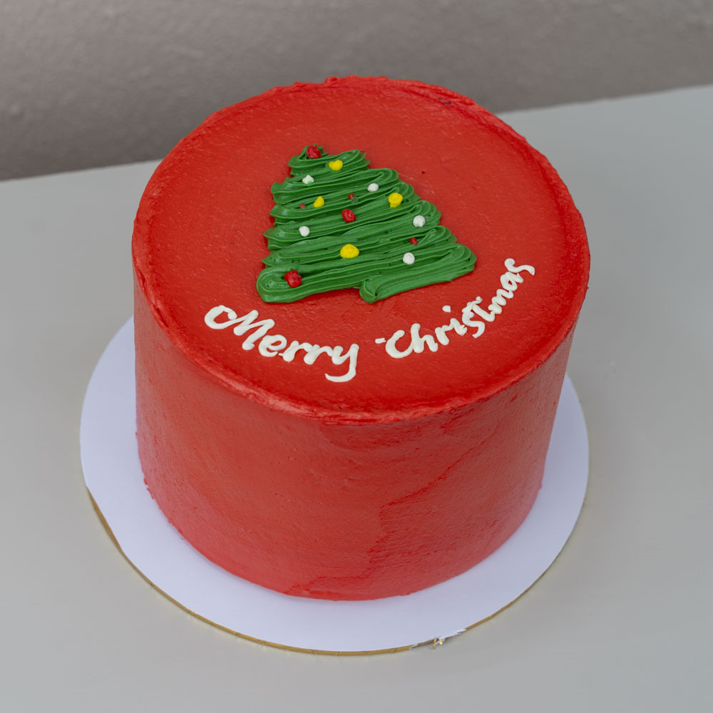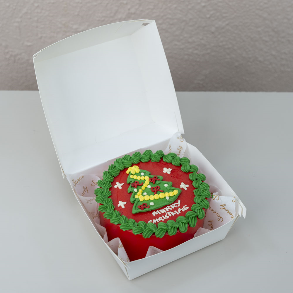 Chocolate cake in an acrylic tray with flowers and balloons.
