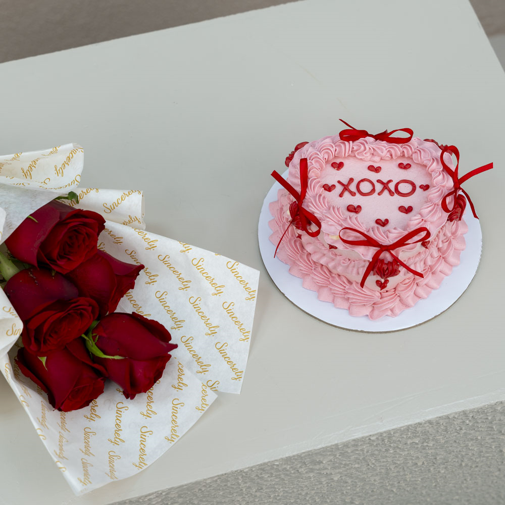 Yummy 4 inches chocolate cake for 2 persons served In a carton box with a hand bouquet of 5 stems of roses.
