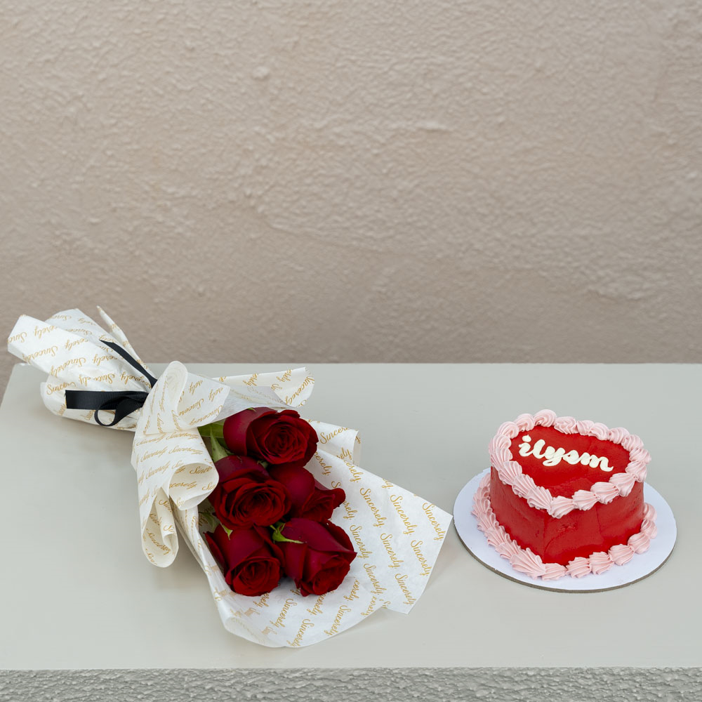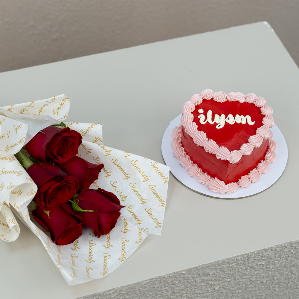 Yummy 4 inches chocolate cake for 2 persons served In a carton box with a hand bouquet of 5 stems of roses.