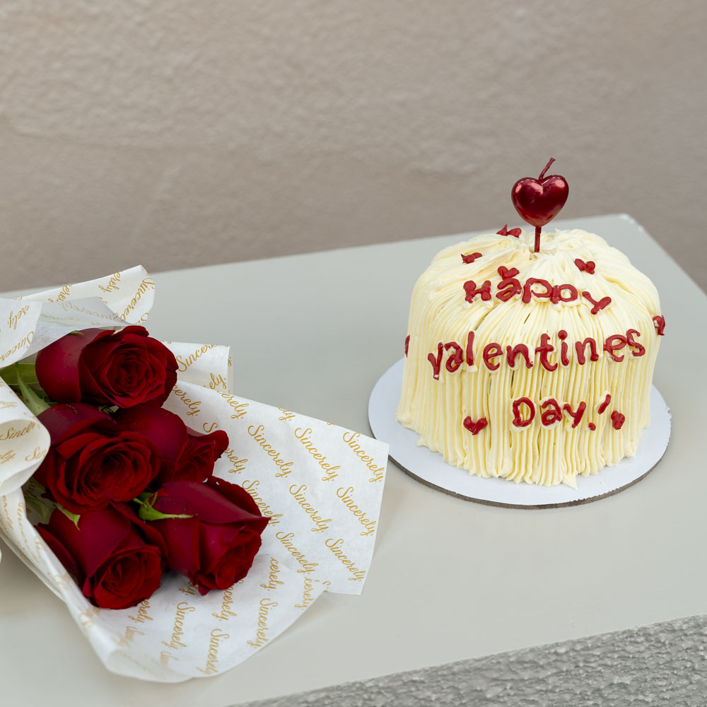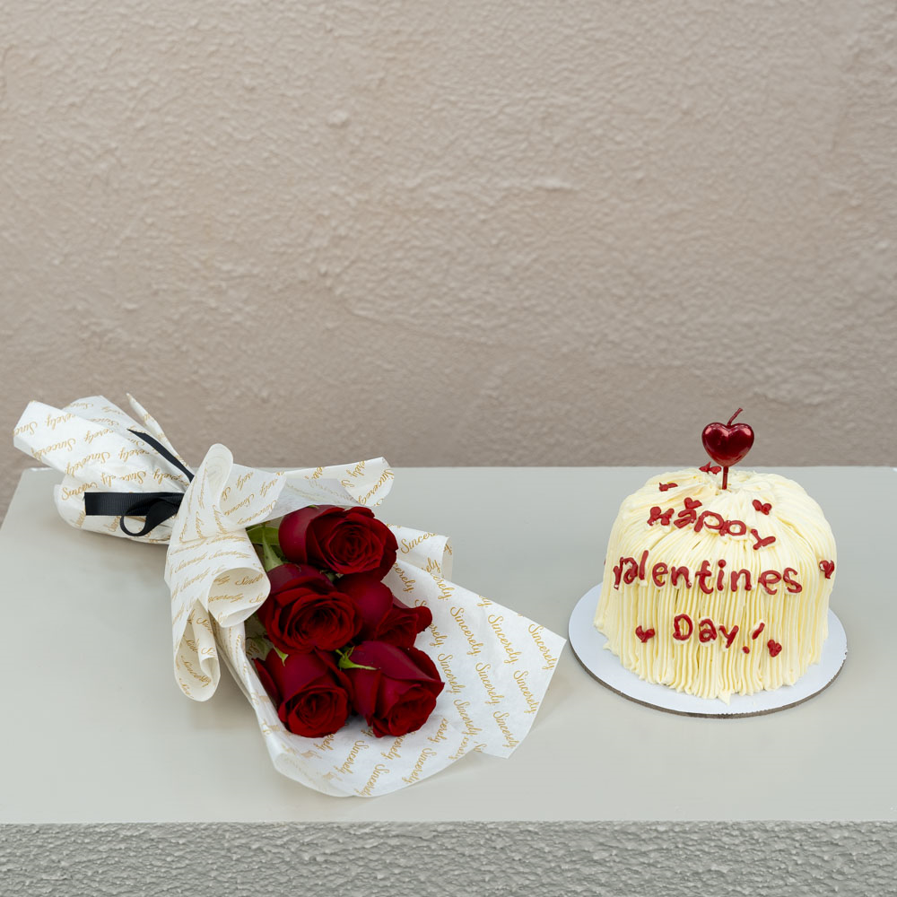 Yummy 4 inches chocolate cake for 2 persons served In a carton box with a hand bouquet of 5 stems of roses.